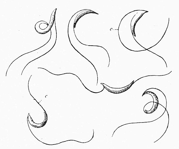A, B, C, D, Elongated spiral forms of Trypanosoma Ziemanni (some intertwined) developed from those of Fig. 53—showing transverse division, nucleus, and blepharoplast.