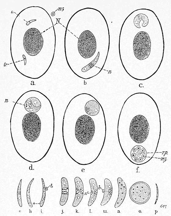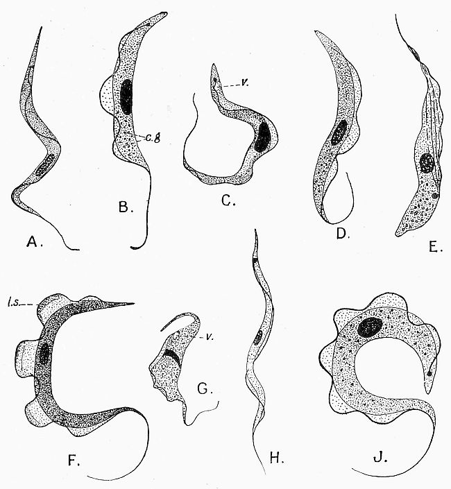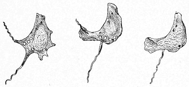 We have yet to learn a good deal more as to the repulsion and the toleration of the trypanosome parasites by mammals and man. Still more have we to learn about the life-history of the trypanosome. At the moment of writing, absolutely nothing has been ascertained as to the life-history of the trypanosome of mammalian blood, except that they multiply in the blood by longitudinal fission. Our ignorance about them is all the more serious since other trypanosomes, discovered by Danilewesky in birds, have been studied and have been shown to go through the most varied phases of multiplication and change of size and shape, including a process of sexual fertilisation like that of the malaria parasite, to which, indeed, it now seems certain the trypanosomes are very closely allied.