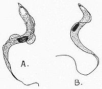 Trypanosome Gambiense, from the blood of men suffering from the early symptoms of sleeping sickness. A, after Bruce and Navarro; B, after Castellani. They show a large oval nucleus (drawn as a black mass), and a small black “micronucleus,” or “blepharoplast” in front.