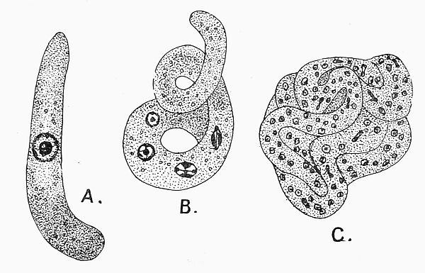 Trypanosoma Ziemanni, from the gut of the gnat (Culex), having been sucked in with the blood of the owl (Athene noctua). A, fertilized vermiform stage. B, multiplication of nucleus. C, elongation and coiling, with increase of nuclei (after Schaudinn).