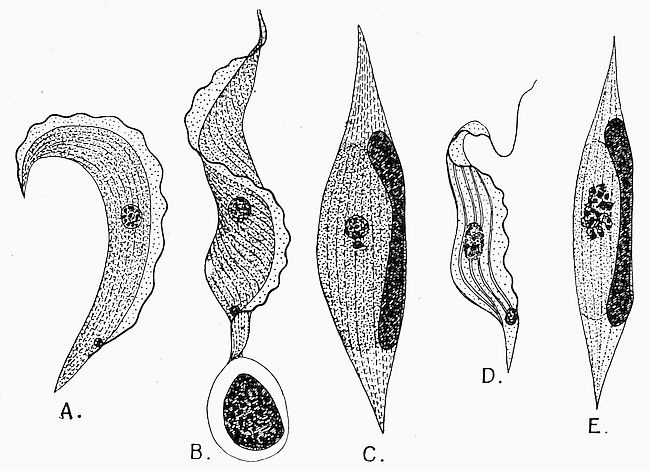 Trypanosoma Ziemanni, from the blood of the little owl. The stages shown in Figs. 52–54 are passed inside the gnat. The spiral and pear-shaped bodies of Fig. 54 pass from the gnat’s proboscis into the blood of the little owl, and grow there into the large forms here figured. A, B, and C are females, destined to be fertilized by spermatozoa (see Fig. 21) when swallowed by a gnat. D and E are male Trypanosomes, which will give rise each to eight fertilizing individuals or spermatozoa as shown in Fig. 56—when swallowed by a gnat.