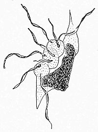 A most characteristic feature, which has been made out by the careful study of these trypanosomes by means of colouring reagents and very high powers of the microscope, is that, whilst there is a large granular nucleus there is also a small body at the anterior end of the animalcule which readily stains and is placed at the end of the root (so to speak) of the vibratile flagellum or free thread. This smaller nucleus has been variously called the “micronucleus,” the “centrosome,” and the “blepharoplast.” It is identical with a structure[177] similarly placed in non-parasitic microscopic animals to which trypanosoma is undoubtedly related. We find it in the phosphorescent noctiluca of our seas, and in various animalcules called “Flagellata.”