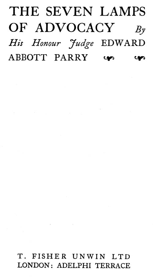 [13]For a race of moderns, that, maybe, care for none of these things, I have lighted again the old lamps which burned so brightly in the days that are gone, which I myself have seen lighting the darkness of our courts, and guiding the footsteps of the judges in the paths of justice and truth. For without a free and honourable race of advocates the world will hear little of the message of justice. Advocacy is the outward and visible appeal for the spiritual gift of justice. The advocate is the priest in the temple of justice, trained in the mysteries of the creed, active in its exercises. For this reason Wyclif in his translation of I John ii. 1 sanctifies the word in the text: “We haue auoket anentis the fadir, Jhesu Crist just.” Modern versions retain “advocate,” but unhappily substitute “righteous” for “just”. Advocacy connotes justice. Upon the altars of justice the advocate must keep his seven lamps clean and burning brightly. In the centre of these must ever be the lamp of honesty.