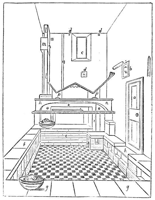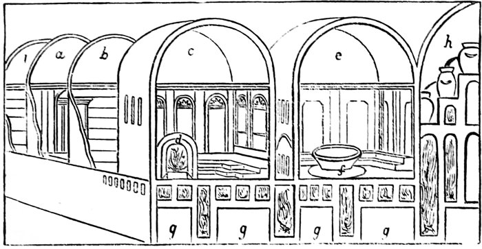 a. The Frigidarium, or cool room. b. The Tepidarium, or room of middle temperature. c. The Calidarium, sudatorium, or concamerata sudatio; around this apartment are seen several ranges of platforms of marble. d. A vaulted stove, covered by an arched cover, clipeus: this stove gave additional heat to the part of the room wherein it was situated, and constituted the Laconicum. e. The Lavatorium or Balneum; there are marble platforms in this apartment, and in its centre is an open bath, called, from its large everted lip upon which the bather sat, labrum. g g. The Hypocaustum. h. The room in which the water is stored and heated. In the uppermost vase the water is cold, as is indicated by the absence of fire beneath it. In the second vase the water is warm, being placed at a considerable height above the fire. In the lowest vase the water is hot. i. The Elaiothesium, or anointing room, from which the bather passes to the Vestiarium or Spoliatorium.