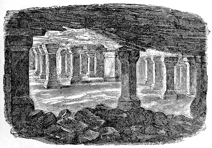 In the foreground are seen three of the short pillars or pilæ, with square shafts and expanded heads and bases. Between these more distant pilæ are visible, seemingly arranged in rows. The floor on which the burning embers lay is uneven; while the roof, which is the under part of the floor of the bath, exhibits evidences of the corroding action of the fire. The Hypocaustum, in the Roman Thermæ, occupied the whole of the under surface of the Calidarium, and the ruins bear evidence of the use of fires of prodigious extent.