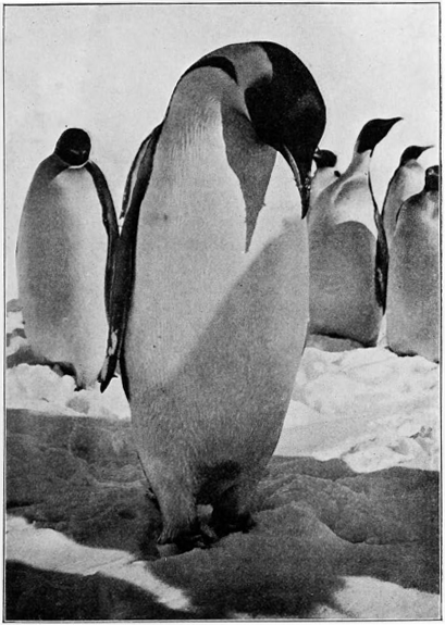 There is endless interest in watching them; the dignified Emperor, dignified in spite of his clumsy waddle, going along with his wife (or wives) by his side, the very picture of a successful, self-satisfied, unsuspicious countryman, and gravely bowing like a Chinaman before a yelping dog, and also the little undignified matter-of-fact Adelie, minding his own business in a most praiseworthy manner. Often they behave with apparent stupidity, but sometimes they show a good deal of intelligence. Their resemblance to human beings is always noticed, partly because they walk erect, but they also have many other human traits. They are the civilised nations of the Antarctic regions, and their civilisation, if much simpler than ours, is in some respects higher and more worthy of the name.