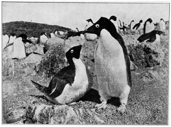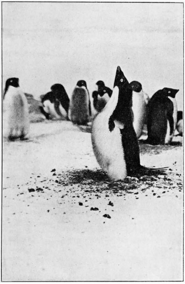 Early in October they began to arrive at the rookery, singly or in pairs. The first to come were the males, and they at once began to scrape up the frozen ground to make hollows for nests, and to collect stones for the walls with which they surrounded them.