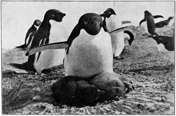 The old Adelies do not mind the cold, their thick blubber and dense fur protecting them sufficiently, and in a blizzard they will lie still and let the snow cover them. Once after a blizzard I went to the rookery and could see no penguins, but suddenly, at some noise, they sprung out of the snow, and I was surrounded by them.