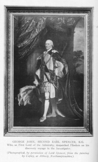 Spencer, Earl, First Lord of the Admiralty, supports Flinders' exploration project. Grants passport to French discovery voyage. Visited by Flinders.