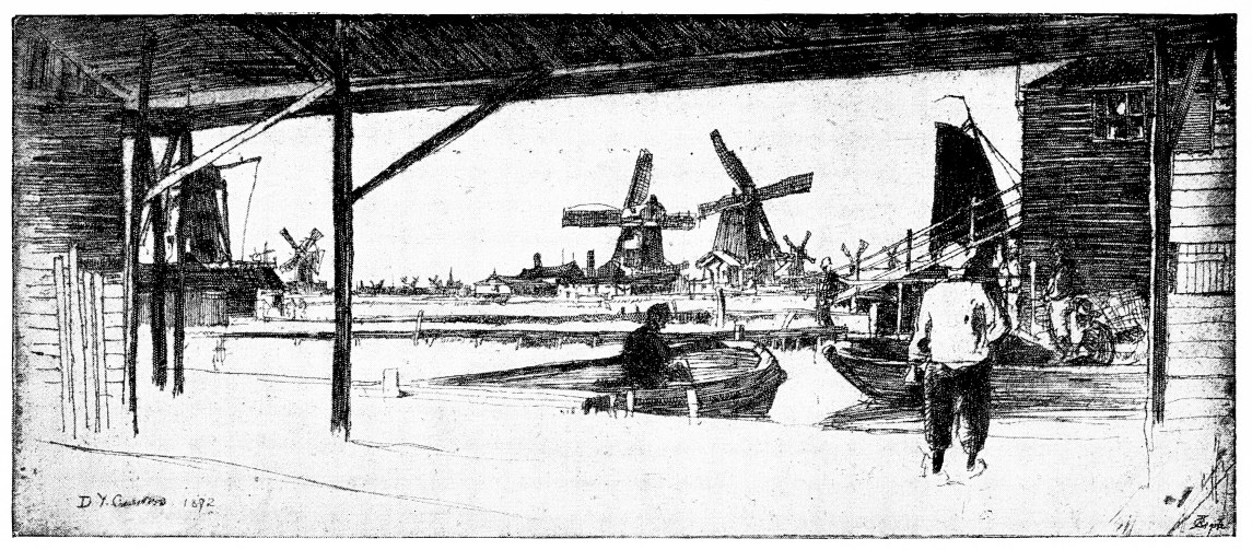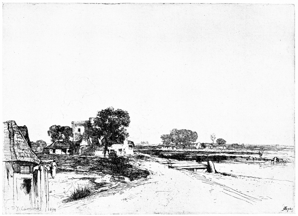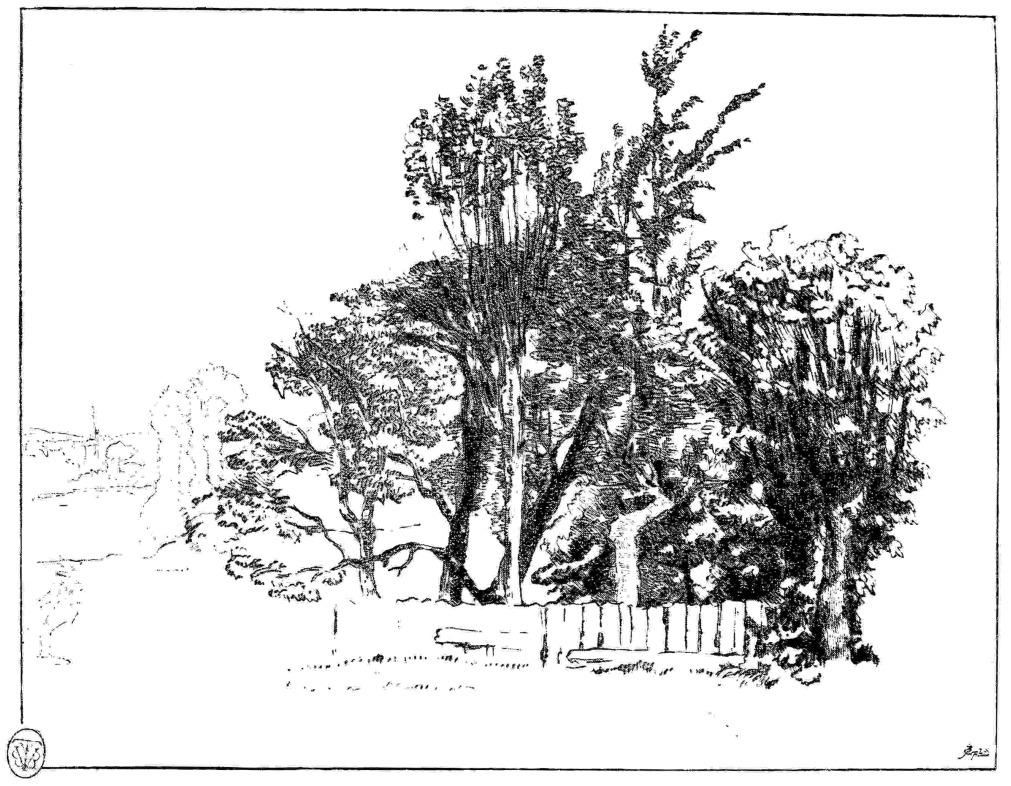AS in France and America, so, very specially, in England, the productions of the etcher have to be divided broadly into two classes, one of which is the result mainly of a commercial demand, and the other, of an artistic impulse. The etcher whose employment of the etching-needle is confined wholly, or confined in the main, to the work of realizing and translating the conceptions of another, is, like the reproductive line-engraver, or the reproductive engraver in mezzotint, little more than the dexterous instrument which carries anothe message. So artistic is his process, when it is properly used, that it is preferable indeed that he be himself an artist as well as a craftsman—it is indeed essential that he shall have some measure of artistic feeling, as well as the flexibility of the executant.{2} But our demands upon him stop, in any case, at a comparatively early point; and we find him more or less sharply cut off in our minds, and in our estimation, from the artist who, when he employs the etching-needle, is occupied with the spontaneous expression of his own thought and fancy—of the particular things of beauty and of interest which may strike him on his way through the world.{3}