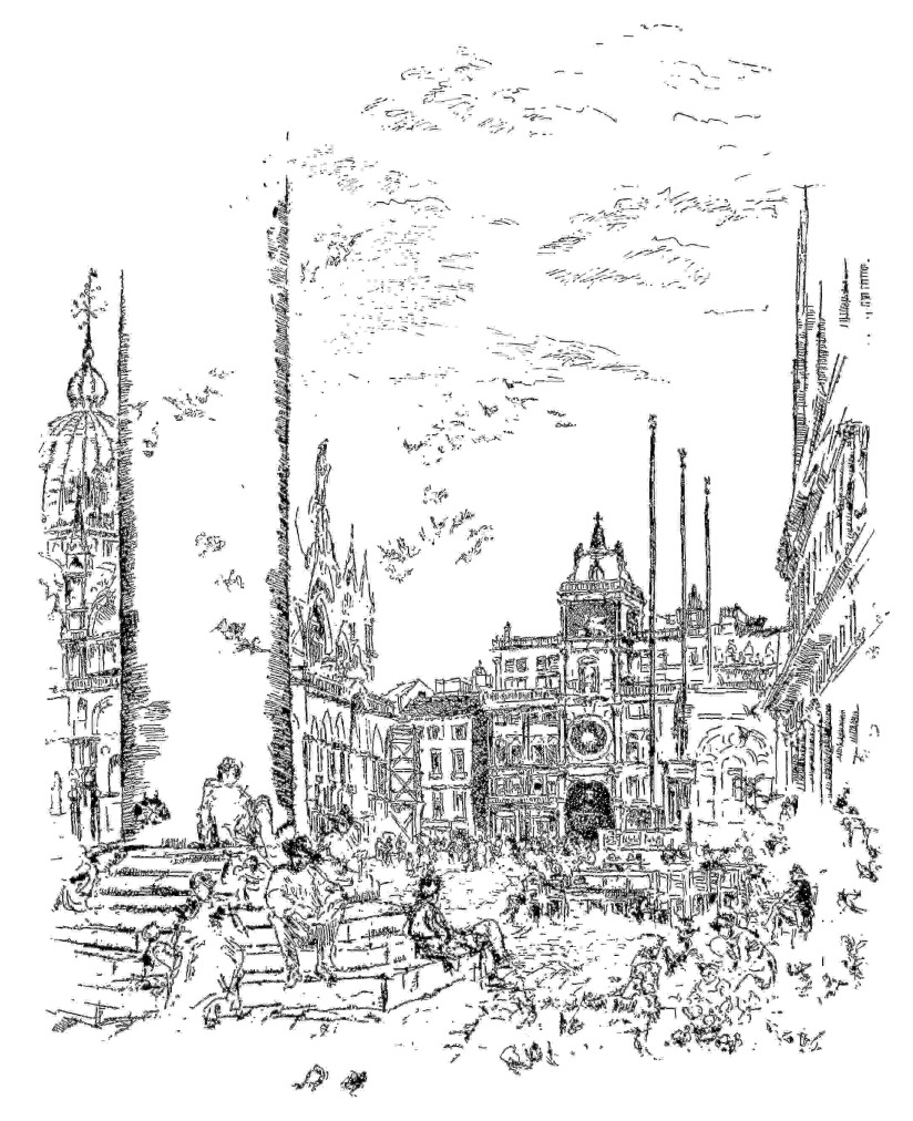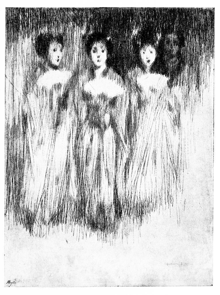 Again, the Whistlerian spirit finds appropriate expression in the vivacious prints of Mr. Walter Sickert and of Monsieur Roussel—many of them engaging, interesting, and unconcealed impromptus, towards which any word of adverse criticism would be but ill-addressed. And, lastly, ere I turn to treat at greater length the work of one who is a born etcher, and an etcher{167}