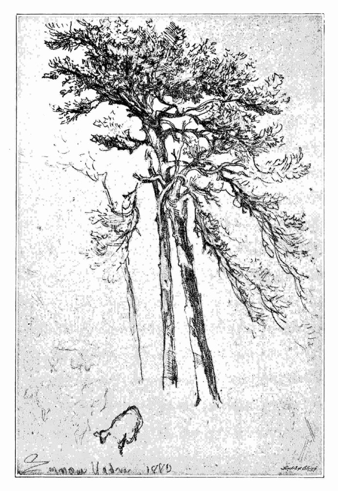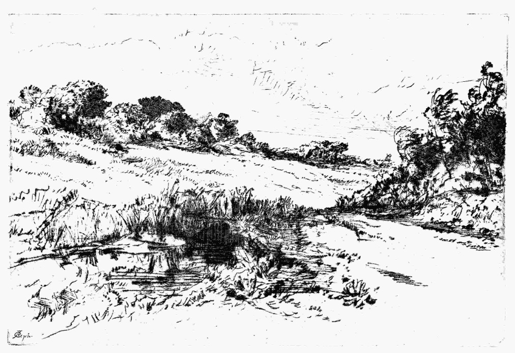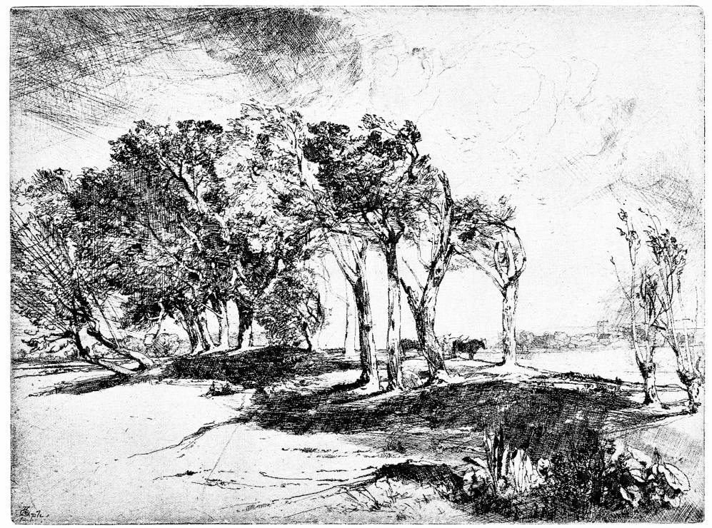 Again, there is Dr. Arthur Evershed, a ready and sensitive draughtsman with the needle, whose “Marsh Farm” is only one out of a score of evidences of his refined enjoyment of the quiet lines of uneventful lowland landscape. Sir Charles Robinson and Dr. Propert need by no means be forgotten. Mr. J. P. Heseltine has not perhaps exhibited much of late; but he, as long ago as when he wrought that series of Etchings Mrs. Noseda published—it was some twenty years since—gave ample proof{166} of his placid, sympathetic observation of the ordinary land, and of his ability to record the charm he was not tardy in feeling. The etched work of Mr. Holmes May is, most of it, I think, more recent. It is a vigorous, independent sketching of landscape. It notes tree-form with energy and sky effects with refinement.
