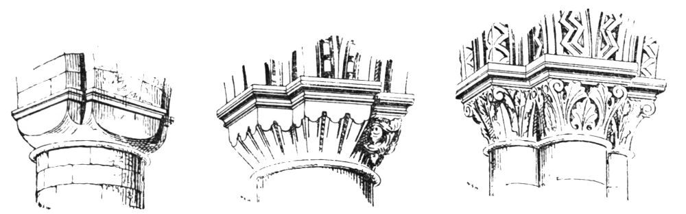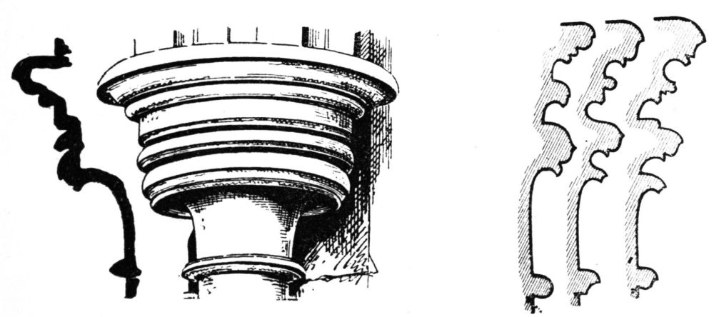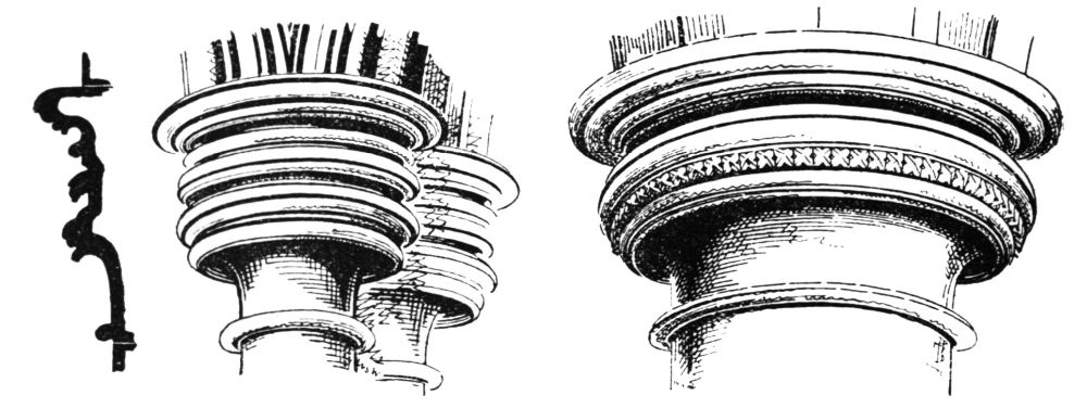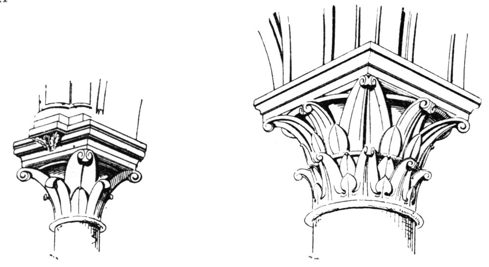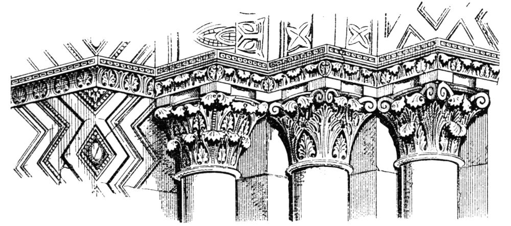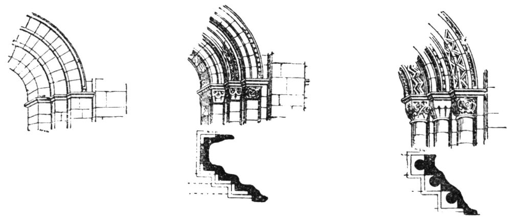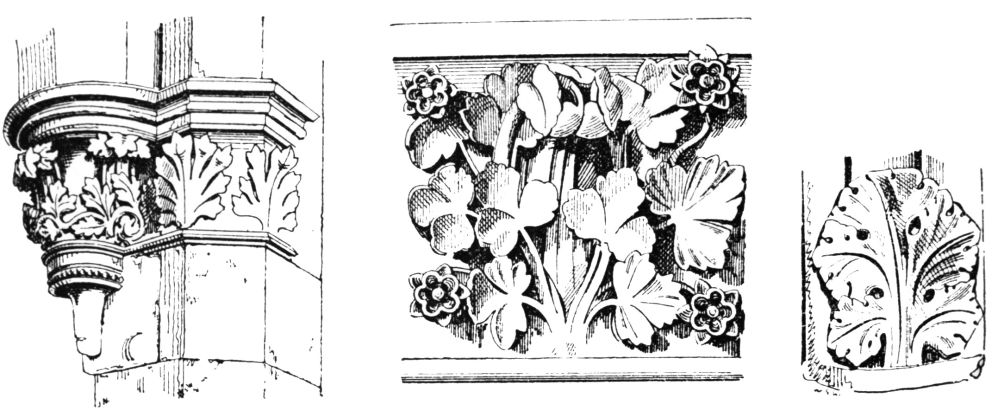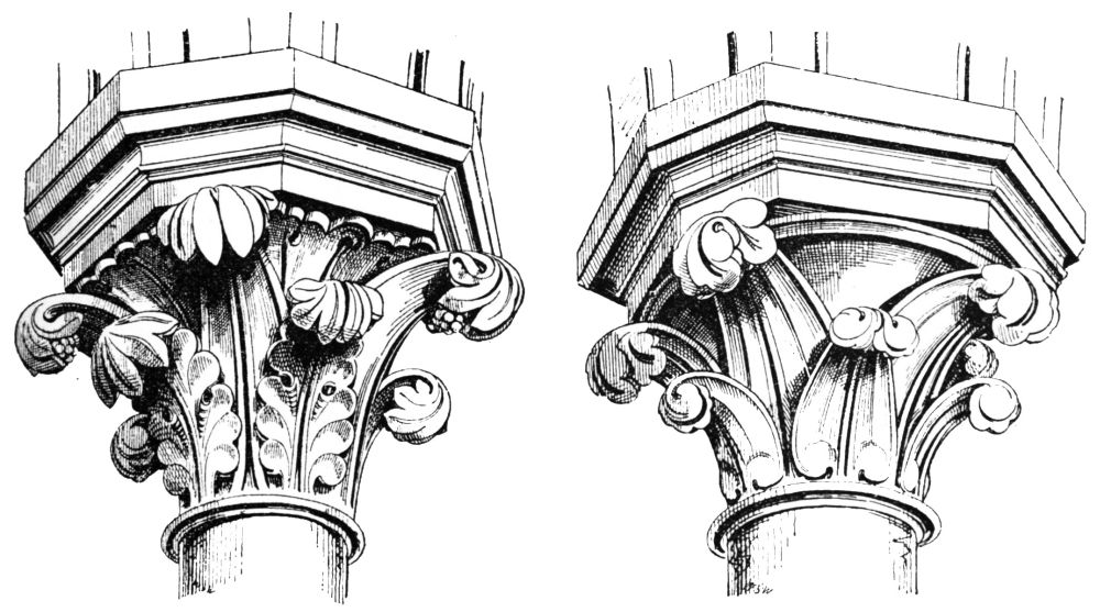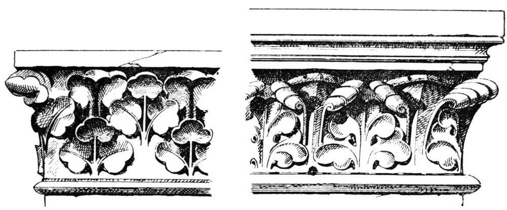 | Gradual refinement of Romanesque—French architects the earliest to systematise the pointed arch—The English before the Germans—The Italians from the Germans—Fully acknowledged in France 1140—Suger’s work at St. Denis—Carving in French churches—Corinthianesque outline of capitals—Distinctly Byzantine capitals—A route by which Byzantine foliage may have reached France—The importation indisputable—Its effects seen in Early English capitals—West front of Chartres—Fluting on basement of doorways—Cathedral of Noyon—St. Germain des Pres, Paris—Cathedral of Sens, prototype of the Choir and Trinity Chapel at Canterbury—Nôtre Dame, Paris—A new kind of foliage—The capital “à crochet”—English transition—Incipient specimens—Refined Norman—Pointed style, with reminiscences of Romanesque—William of Sens—William the Englishman—Influence of French work—Oakham Castle—Glastonbury Abbey—Cathedral of St. David’s—Temple Church, London—Chichester Cathedral—Tynemouth Abbey—Hexham Abbey—Unfoliated capitals—Round moulded capitals—Characteristics of English and French transition—The German transition—Practical lessons from studying these changes—Principles to which the transition was pioneer | Page 69 |