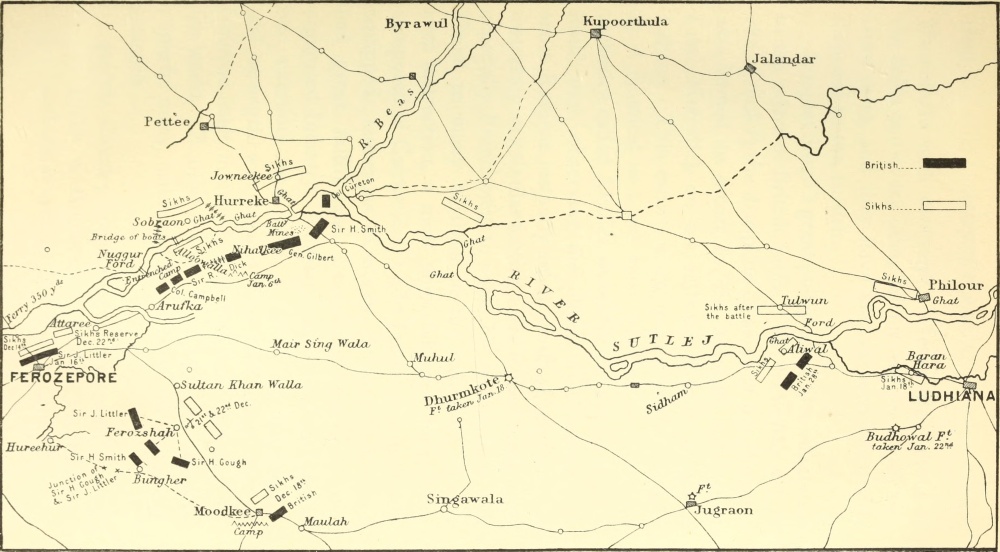 I have, indeed, generally printed “Sutlej,” though Sir Harry frequently or generally wrote “Sutledge;” but I have kept in his own narrative his spelling “Ferozeshuhur” (which is, I believe, more correct) for the battle generally called “Ferozeshah.” Even Sir Harry’s native place (and my own) has two spellings, “Whittlesey” and “Whittlesea.” In his narrative I have preserved his usual spelling “Whittlesea,” but I have [x]myself used the other, as I have been taught to do from a boy.