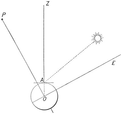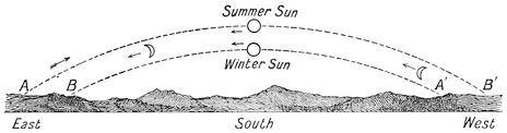 He would see the sun rise in the east, slowly mount the heavens till it stood over the south at middle day, then it would sink towards the west and disappear. In summer the rising point of the sun would be more to the northward than in winter, and so also would be its point of setting A´. In winter it would rise a little to the south of east,16 and set a little to the south of west, and not rise so high in the heavens at midday, so that the summer day would be longer than the winter day. If the day were always divided into twelve hours, whether it were long or short, then in summer the hours of the day would be long; in winter they would be short. This mode of dividing the day was that used by the Greeks. The Egyptians, on the other hand, averaged their day by dividing the whole round of the sun into twenty-four hours, so that the summer day contained more hours than the winter day. Hence, for the Egyptians, sun-rise did not always take place at six o’clock. For in winter it took place after six, and in summer before six; and this is the system that has descended to us.