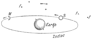 It was also observed that during its cycle of changes, the sun was slowly moving round backwards among the stars in the same direction as the moon, only it made its retrograde cycle in a year, and thus arose the division of time into months and years. The stars turned round in the heavens once in the complete day. The sun, therefore,18 appeared to move back among them, passing successively through groups of stars, so as to make the circuit of them all in a year. The stars through which he passed in a year, and through which the moon travelled in a month, were divided by the ancients into groups called constellations, and its yearly path in the heavens was called the zodiac. There were twelve of these constellations in the zodiac called the signs. Hence, then, the sun passed through a sign in every month, making the tour of them all in the year. To these signs fanciful names were given, such as “the Ram,” “the Water-bearer,” “the Virgin,” “the Scorpion,” and so on, and the sun and moon were then said to pass through the signs of the zodiac.