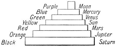 This weekly scheme came probably from the Chaldean astronomers. It appears probable that the great tower of Babel, the ruins of which exist to this day, consisted of seven stages, one over the other, the top one painted white, or perhaps purple, to represent the Moon, the next lower blue for Mercury, then green for Venus, yellow for the Sun, red for Mars, orange for Jupiter, and black for Saturn. Unfortunately, of the colours no trace now remains.