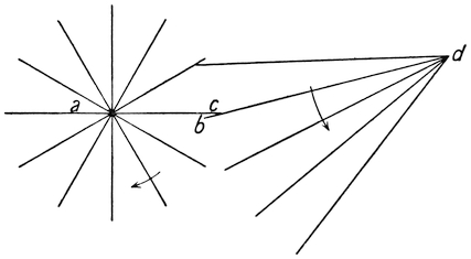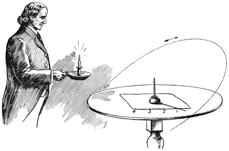 If the person holding the candle walk round the table at a uniform speed, the shadow will go round like the hand of a clock, and might be made to mark the time. If the candle took twenty-four hours to go round the table, as the sun takes twenty-four hours to go round the earth, then marks placed on28 the paper would serve to measure the hours, and the paper and pen would serve as a sort of sun-dial.