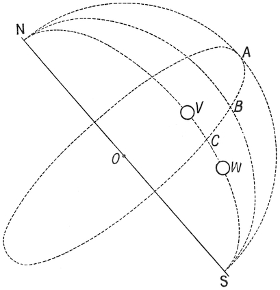 Let us suppose that N O S is the axis of the29 heavens, and the lines N A S, N B S, N C S, are meridian lines drawn from one of the poles N of the heavens round on the surface of a celestial sphere whose centre is at O. Let A B C be a circle also on this sphere, passing through O, the centre of the sphere, in a plane at right angles to N S, the axis. Then A B C is called the equatorial. It is a circle in the heavens corresponding to the equator on the earth. At the vernal and autumnal equinox,30 namely on March 25 and September 25, the sun is in the equatorial. In midsummer and midwinter it is on opposite sides of the equatorial. In midsummer it is nearer to N, as at V; in midwinter it is nearer to S, as at W. Suppose we were on an island in the midst of a surrounding ocean, we should only have a limited range of view. If the highest point on the island were 100 feet, then from that altitude we should be able to see about thirteen miles to the horizon. More than that could not be seen on account of the rotundity of the earth.