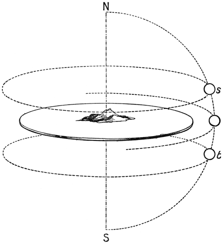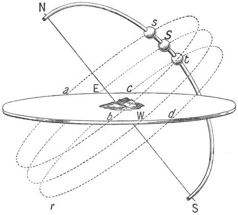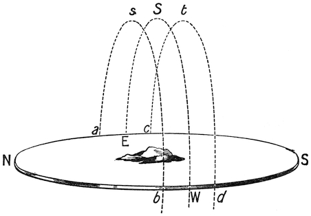 In summer the sun is higher, and nearer to the pole N, say at a point s. It rises at a point a in the ocean more to the north than E, the eastern point, and sets at a point b, also more north than W, the western point, and traverses the path a s b. But to traverse this path it takes longer than twelve hours, for a s b is more than half the circle31 a s b. Hence then it rises say at 4.30 a.m. and sets at 7.30 p.m. The night, during which the sun moves round the path from b to a, is correspondingly short, being only nine hours in length, from 7.30 p.m. till 4.30 a.m. So you have a long summer day and a short summer night. But in winter, when the sun gets nearer to the south pole of the heavens, it rises at a point C in the ocean at 7.30 a.m., and traverses the arc c t d, and sets at the point d at 4.30 p.m. So that the winter day is32 only nine hours long. But the winter night lasts from 4.30 p.m. till 7.30 a.m., and is therefore fifteen hours long, the sun going round the path d r c in the interval. It is therefore the obliquity of the poles N S, coupled with the fact that the sun’s position is nearer to one pole, N, in summer, and nearer to the other pole, S, in winter, that produces the inequality of days and nights in our latitudes. Suppose our island were on the equator. The north pole and the south pole would appear to be on the horizon, and then whether the sun moved in the circle a s b in the summer, or E S W at the vernal or autumnal equinoxes, or c t d in the winter, in each of these cases, though the places of rising33 and setting in the ocean might vary in summer from a and b to c and d in winter, yet in each of these cases the path from a to b, A to B, and c to d would still always be a half-circle and occupy twelve hours. Hence at the equator the days and nights never vary in length, but the sun always rises at six and sets at six. And, besides, it always rises straight up from the ocean and plunges down vertically into it, so that there is but little twilight and dawn.