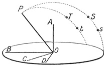 In latitudes such as that of England, where the pole of the earth is inclined at an angle to the horizon, it is necessary that the rod, or “style” as it is called, of the sun-dial should be inclined to the horizontal. For if we used an upright “style,” as O A, then when the sun was in the south, at midday, the shadow would lie along the same direction, O B, whether the sun were high in summer, as at S, or low in winter, as at s. But at other hours, such as nine o’clock in the morning, the shadow of the “style” O A would, when the sun was at its summer position T, lie along O D, whereas when the sun was at its winter position t the shadow would lie along O C. Thus the time would appear different in summer and in36 winter; and the dial would lead to errors. But if the “style” is inclined in the direction of the poles, then, however, the sun moves from or towards the pole. As its position varies in winter and summer, the shadow still remains unchanged for any particular hour, and it is only the circular motion of the sun round in its daily path that affects the position of the shadows.