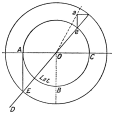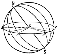 To divide the dial, we have only to imagine it surrounded by a sort of cage formed of twenty-four arcs drawn from the north pole to the south pole, and equidistant from one another. In its course the sun would cross one of them every hour. Hence the points to which the shadows o a, o b, o c, o d, of the inclined “style” O N would point are the points where these arcs meet the horizontal circle. This consideration leads to a simple method of constructing a sun-dial, which37 is given at the end of this chapter in an appendix.