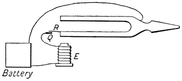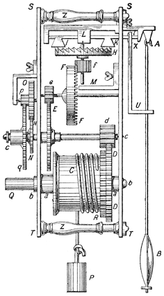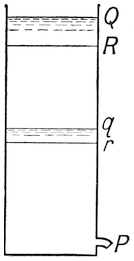 Sun-dials were only available during the hours of the day when the sun was shining. The desire to mark the hours of the night led to the adoption of water clocks, which measured time by the amount of water which escaped from a small hole in a level of water. Some care, however, is required to secure correct registration. For suppose that we have a vessel with a small pipe leading out near the bottom, then the amount of water which will run out of the pipe in a given time depends upon the pressure38 of the water at the pipe, and this depends in its turn upon P Q, the head of water in the vessel. Whence it follows that the division Q R, due to say an hour’s run of the clock at Q R, will be more than q r, the division corresponding to an hour, at q, a point lower down between P and Q, and hence the divisions marked on the vessel to show the hours by means of the level of the water would be uneven, becoming smaller and smaller as the water fell in the vessel.