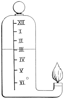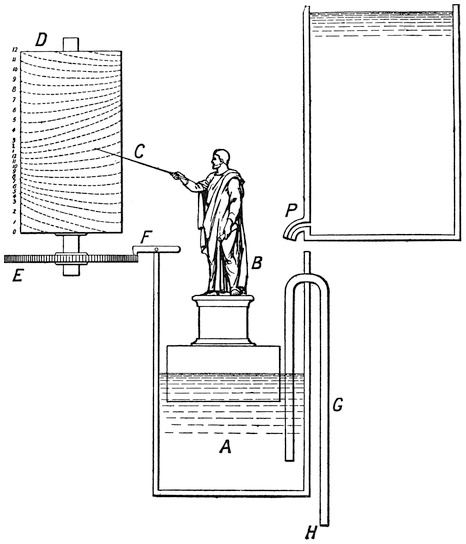 To avoid the inconvenience of unequal divisions, the water to be measured was allowed to escape into an empty vessel from a vessel in which its surface was always kept at a constant level. Inasmuch as the pressure on the pipe or orifice in the vessel in which the water was always kept at a constant level was always constant, it followed that equal volumes of water indicated equal times, and the vessel into which the water fell needed only to be equally divided.
