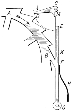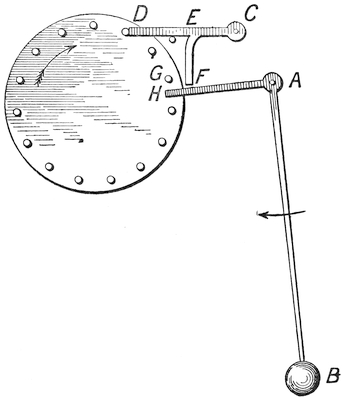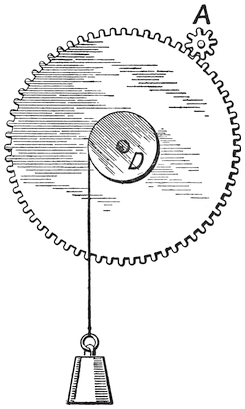 In order, therefore, to make the water clock available in Greece and Italy, it became necessary to make the hours unequal, and to arrange them to correspond with unequal hours of the Greek day. This plan was accomplished as follows. Upon the water which was poured into the vessel that measured the hours was placed a float; and on the float stood a figure made of thin copper, with a wand in its hand. This wand pointed to an unequally divided scale. A separate scale was provided for every day in the year, and these scales were mounted on a drum which revolved so as to turn round once in the year. Thus as the figure rose each day by means of a cogwheel it moved the drum round one division, or one three hundred and sixty-fifth part of a revolution. By this means the scale corresponding to any particular day of winter or summer was brought opposite the wand of the figure, and thus the scale of hours was kept true. In fact, the water clock, which kept true time, was made by artificial means to keep untrue time, in order to correspond with the unequal hours of the Greek days. In the picture A is the receiving water vessel, P the pipe through which the water flows; B is the figure, C the rod; D is the drum, made to revolve by the cogwheel E, containing 365 teeth, of which one tooth was driven forward at the close of40 each day. A syphon G was fixed in the vessel A, so that when the figure had risen to the top and pushed forward the lever F, the syphon suddenly emptied the vessel through the pipe H, and the figure fell to the bottom of the vessel A and became ready to41 rise and register another day. The divisions on the drum are, of course, uneven. On one side, corresponding to the summer, the day hours would reckon about seventy minutes each, the night hours would be only about fifty minutes each, so that the day divisions on the scale would be long, and the night divisions short. The reverse would be the case in winter. And, therefore, the lines round the drum would go in an uneven wavy form.