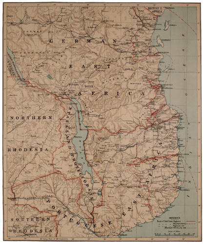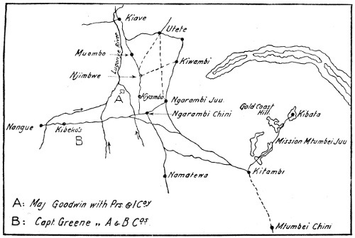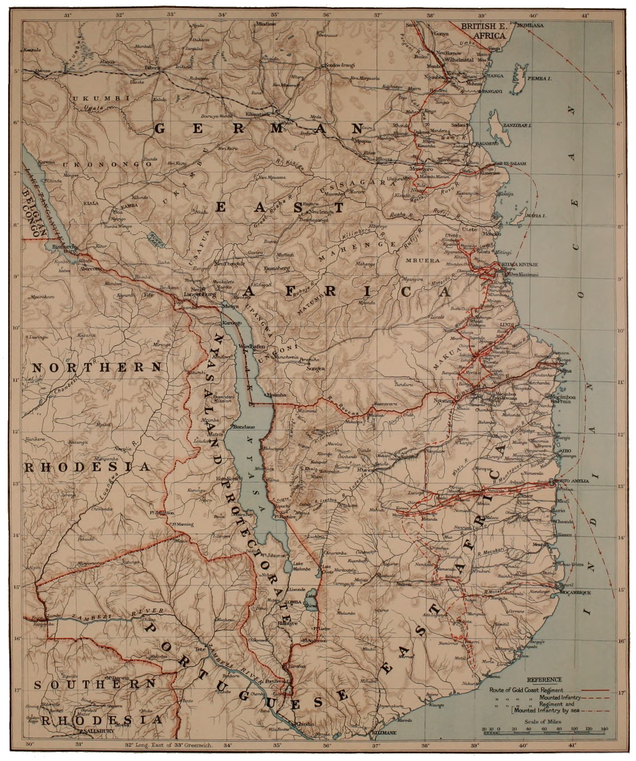 The military situation, at the moment when the Gold Coast Regiment received its orders to take the field, was approximately as follows. Tanga, the coast terminus of the more northerly of the two German railways, had fallen some time before, and the whole line from Moschi to the sea was now in the hands of the British. A column of Indian troops was moving down the coast with Sandani at the mouth of the Wami river, Bagamoyo at the mouth of the Kingani, and Dar-es-Salaam, the terminus of the principal railway, as its successive objectives. The enemy had been driven, not only away from the Tanga-Moschi railway, but to the south of the Pangani-Handeni-Kondoa-Irangi road; and General Smuts had established General Headquarters on the left bank of the Lukigura River, which falls into the Wami on its left bank at a point distant some sixty miles from its mouth.