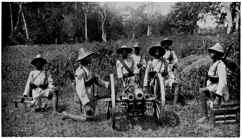 When during the latter days of July, 1914, the prospect of war with the German Empire became imminent, the Gold Coast Regiment was rapidly mobilized, and detachments took up pre-arranged strategical positions on the borders of Togoland. On the declaration of war on the 4th August, the invasion of this German colony was promptly undertaken; and the Regiment, which had been joined at Lome, the capital of Togoland, by a small party of Tirailleurs from Dahomey, pursued the retreating enemy up the main line of railway to Kamina—the site of a very large and important German wireless installation—where, on the 28th August, he was forced to an unconditional surrender.