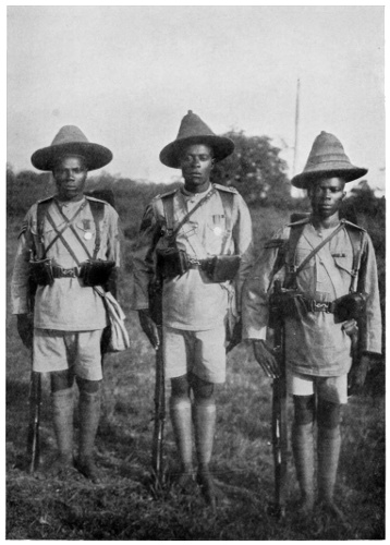 While daylight lasted the way led mostly through open grass country apparently very sparsely inhabited, which was succeeded later by what looked like dense thorn-jungle, and the junction at Voi was reached by the first train at about midnight. From this point the military authorities had constructed a loop-line, which runs in a south-westerly direction through the mountain range, of which on the north-west Kilima-Njaro is the stupendousstupendous culmination, until it effects a junction with the German railway from Tanga to Moschi at a point some twenty miles south of the last-named place. At dawn, therefore, the men of the Regiment, shivering for their skins, looked out upon wide expanses of mountain scenery—a vast sweep of hillsides, rounded summits and undulations, covered with short grass, and strewn with gigantic boulders of rock. In the distance Kilima-Njaro was frequently visible, with its crest covered by perpetual snow. The line ran from Voi to the junction with the Tanga-Moschi railway at heights varying from 6000 to 9000 feet; and the men of the Gold Coast Regiment, who are accustomed to regard 60° F. as registering a temperature which is almost unbearably cold, and who were still damp 8from the drenching they had received at Kilindini, suffered seriously from the low temperature. The fact that nearly half of them were accommodated in trucks, which though roofed had only half walls, rendered the exposure all the more severe. A few halts were allowed in order to enable the men to stretch their legs; but time did not admit of much cooking being done, and for the most part the, to them, unnatural foods of bully beef and biscuit, and draughts of ice-cold water, were all that they had to restore the natural heat of their bodies. It was an extremely trying experience for troops recruited in the Tropics, and many cases of pneumonia subsequently resulted, not a few of which proved fatal.