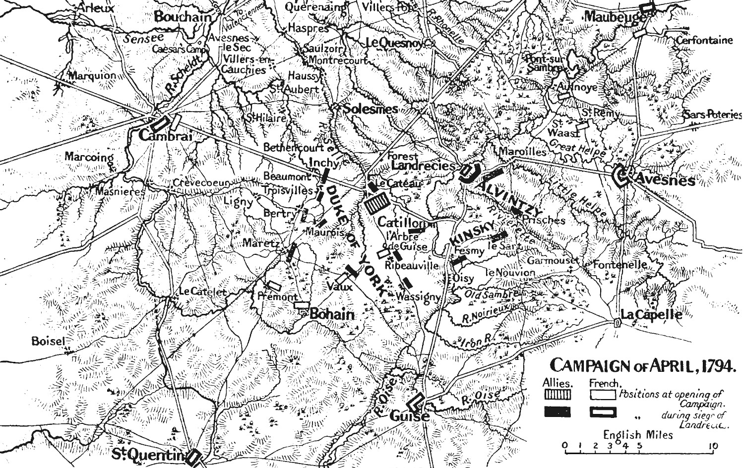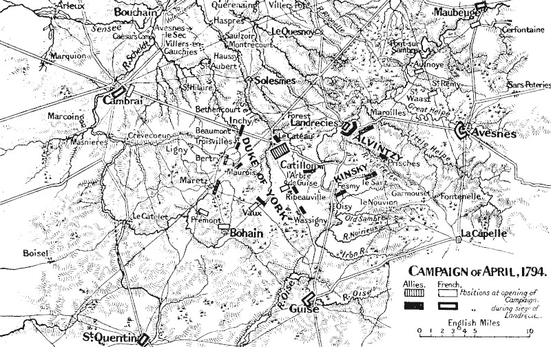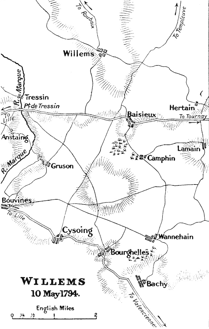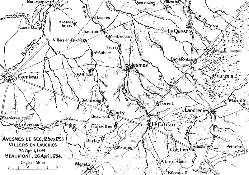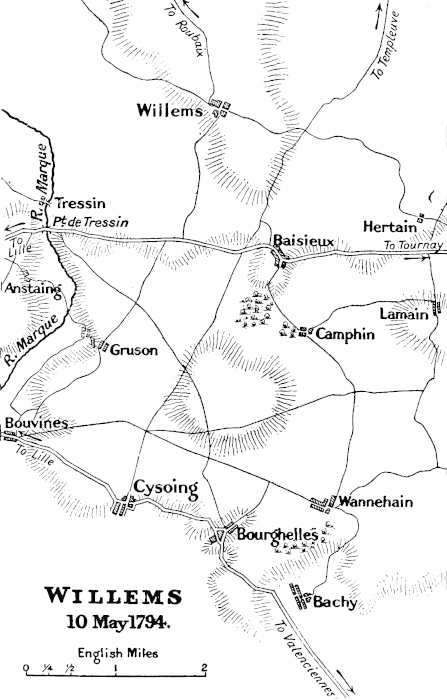 [242] There are few actions which I have found so difficult to describe as this of the 18th of May. I have drawn my account from Witzleben, iii. 201–230; Ditfurth, ii. 130–157; Jomini; Narrative of an Officer, ii. 47–51; Cannon’s Records of the Seventh and Fifteenth Hussars and Sixteenth Lancers; Calvert’s Journal; and Craig’s letters to Nepean of 19th May 1794 (Record Office).
