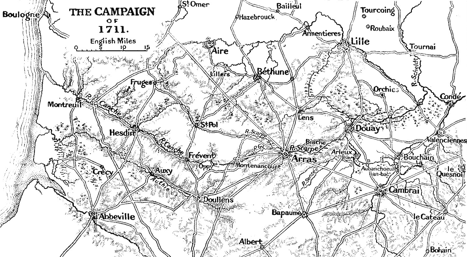 France, on the other hand, possessed the finest and strongest army in Europe,—well equipped, well trained, well organised, and inured to work by countless campaigns. She had a single man in supreme control of affairs, King Lewis the Fourteenth; a great war-minister, Louvois; one really great general, Luxemburg; and one with flashes of genius, Boufflers. [Pg 8] Moreover, she possessed a line of posts in Spanish Flanders extending from Dunkirk to the Meuse. On the Lys she had Aire and Menin; on the Scarpe, Douay; on the Upper Scheldt, Cambray, Bouchain, Valenciennes, and Condé; on the Sambre, Maubeuge; between Sambre and Meuse, Philippeville and Marienburg; and on the Meuse, Dinant. Further, in the one space where the frontier was not covered by a friendly river, between the sea and the Scheldt, the French had constructed fortified lines from the sea to Menin and from thence to the Scheldt at Espierre. Thus with their frontier covered, with a place of arms on every river, with secrecy and with unity of purpose, the French enjoyed the approximate certainty of being able to take the field in every campaign before the Allies could be collected to oppose them.