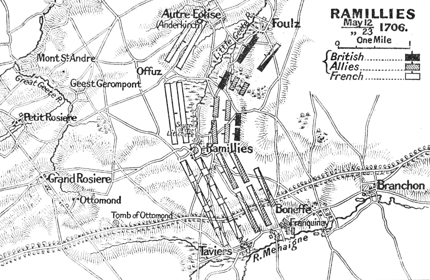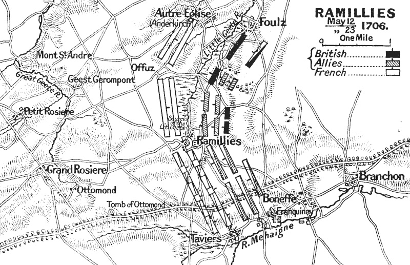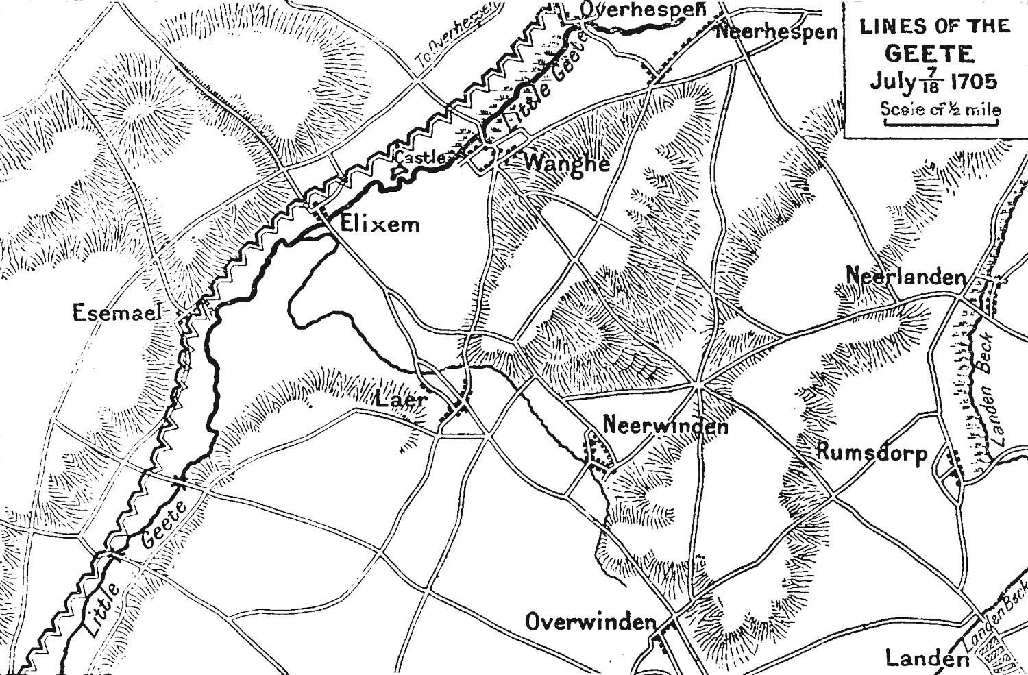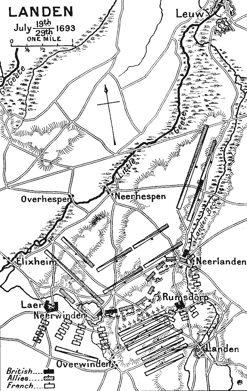 Glancing at it on the map, the reader will see that this quadrilateral is cut by a number of rivers running parallel to each other from south to north, and flowing into the main streams of the Demer and the Scheldt. The first of these, beginning from the east, are the Great and Little Geete, which become one before they join the main stream. It is worth while to pause for a moment over this little slip of land between the Geete and the Meuse. We shall see much of Namur, Huy, Liège, and Maestricht, which command the navigation of the greater river, but we shall see still more of the Geete, and of two smaller streams, the Jaar and the Mehaigne, which rise almost in the same table-land with it. On the Lower Jaar, close to Maestricht, stands the village of Lauffeld, which shall be better known to us fifty years hence. On the Little Geete, just above its junction with its greater namesake, are the villages of Neerwinden and Landen. In the small space between the heads of the Geete and the Mehaigne lies the village of Ramillies. For this network of streams is the protection against an enemy that would threaten the navigation of the Meuse from the north and west, and the barrier of Spanish Flanders against invasion from the east; and the ground is rich with the corpses and fat with the blood of men.