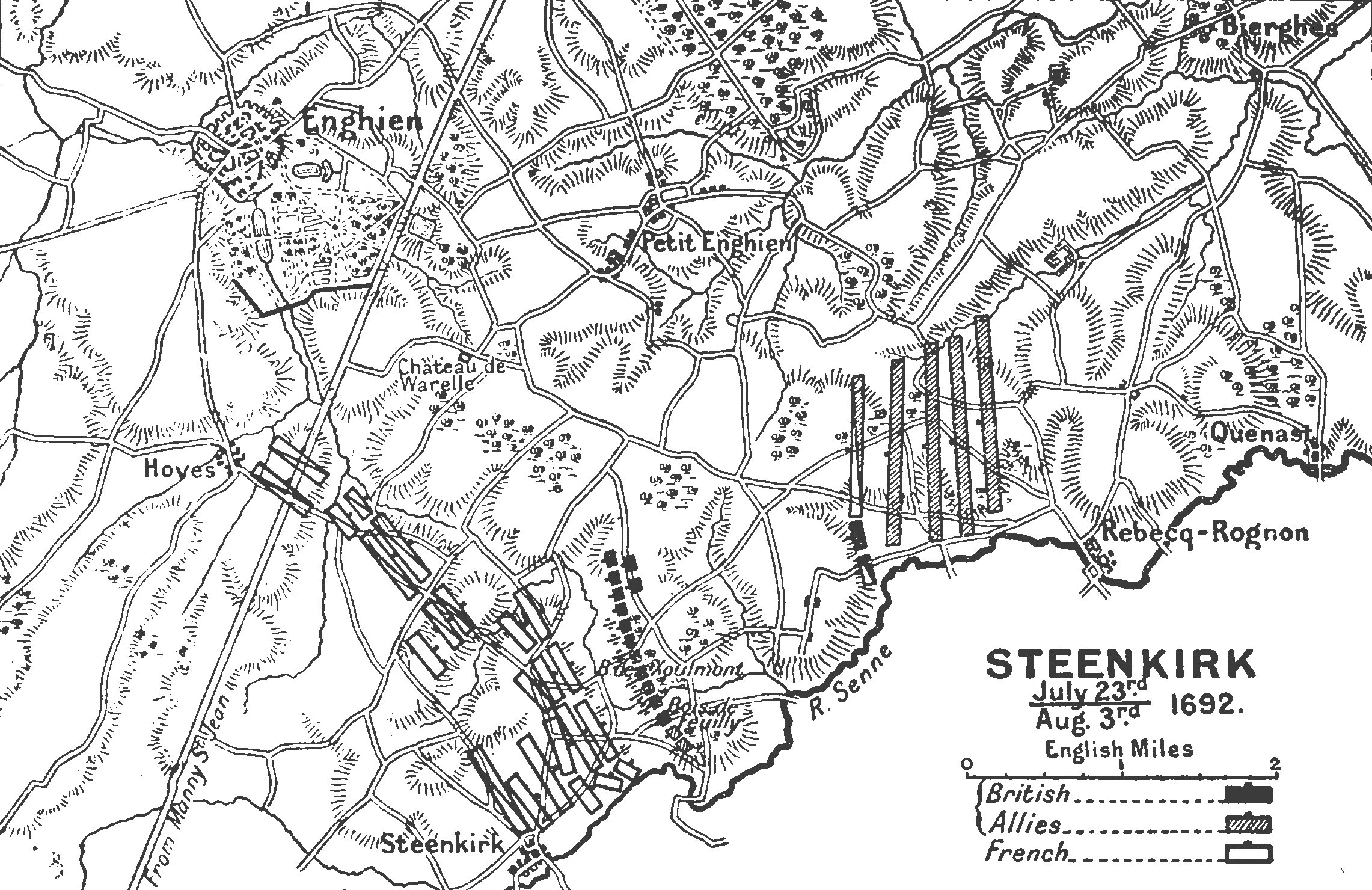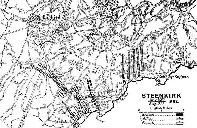 The next stream to westward is the Dyle, which flows past Louvain to the Demer, and gives its name, after the junction, to that river. The next in order is the Senne, which flows past Park and Hal and Brussels to the same main stream. At the head of the Senne stands the village of Steenkirk; midway between the Dyle and Senne are the forest of Soignies and the field of Waterloo.
