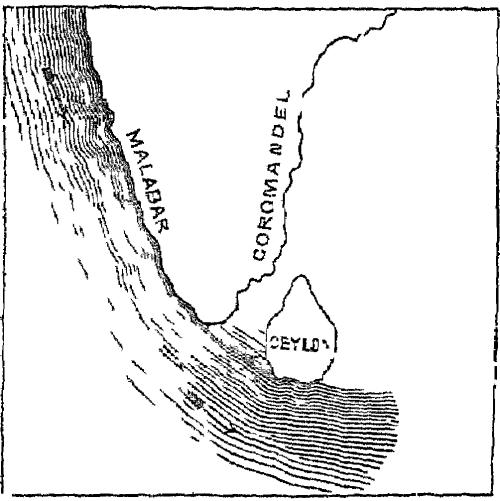 The truth, however, is, that there were Arabs in Ceylon ages before the earliest date named in these conjectures[1]; they were known there as traders centuries before Mahomet was born, and such was their passion for enterprise, that at one and the same moment they were pursuing commerce in the Indian Ocean[2], and manning the galleys of Marc Antony in the fatal sea-fight at Actium.[3] The author of the Periplus found them in Ceylon about the first Christian century, Cosmas Indico-pleustes in the sixth; and they had become so numerous in China in the eighth, as to cause a tumult at Canton.[4] From the tenth till the fifteenth century, the Arabs, as merchants, were the undisputed masters of the East; they formed commercial establishments in every country that had productions to export, and their vessels sailed between every sea-port from Sofala to Bab-el-Mandeb, and from Aden to Sumatra.[5] The "Moors," who at the present day inhabit the coasts of Ceylon, are the descendants of these active adventurers; they are not purely Arabs in blood, but descendants from Arabian ancestors by intermarriage with the native races who embraced the religion of the Prophet.[6] The Singhalese epithet of "Marak-kala-minisu" or "Mariners," describes at once their origin and occupation; but during the middle ages, when Ceylon was the Tyre of Asia, these immigrant traders became traders in all the products of the island, and the brokers through whose hands they passed in exchange for the wares of foreign countries. At no period were they either manufacturers or producers in any department; their genius was purely commercial, and their attention was exclusively devoted to buying and selling what had been previously produced by the industry and ingenuity of others. They were dealers in jewelry, connoisseurs in gems, and collectors of pearls; and whilst the contented and apathetic Singhalese in the villages and forests of the interior passed their lives in the cultivation of their rice-lands, and sought no other excitement than the pomp and ceremonial of their temples; the busy and ambitious Mahometans on the coast built their warehouses at the ports, crowded the harbours with their shipping, and collected the wealth and luxuries of the island, its precious stones, its dye-woods, its spices and ivory, to be forwarded to China and the Persian Gulf.