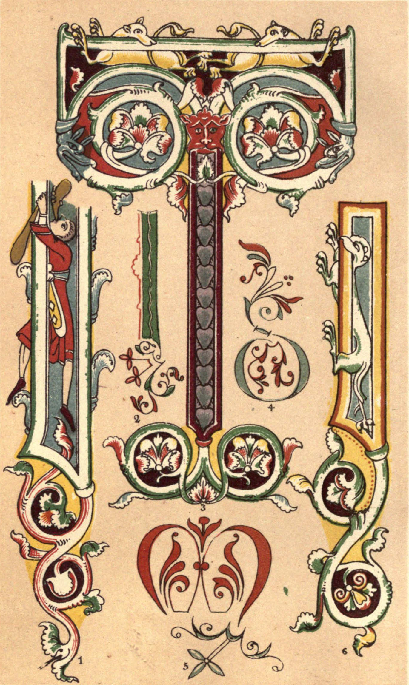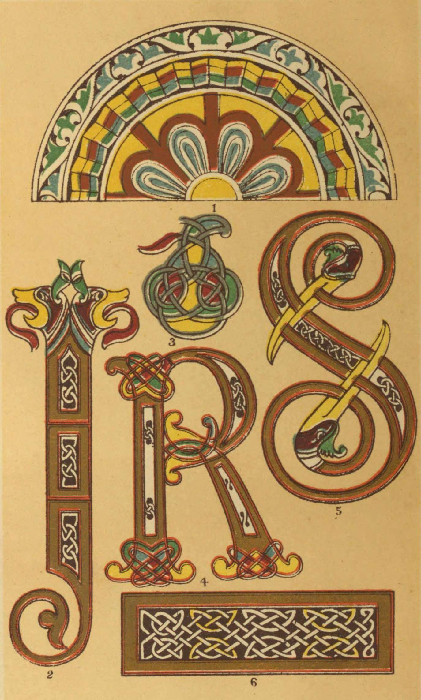 Plate I.—From the fragments of the Bible of Charles the Bald, preserved in the British Museum, Harleian 7551. In most of the MSS. of the date of Charlemagne and his immediate successors, the ornamental forms are generally compounded of Anglo-Saxon and semi-classical details; thus, fig. 1 presents us with a lunette, or arch-filling, borrowed from some Latin type; while in figs. 3, 4, 5, the interlaced knots, and in figs. 2 and 6 the "zoomorphic" terminations, are equally characteristic of Celtic art. This class of conventional design, although apparently complicated, is of comparatively easy execution, and on that account forms a suitable style for the young illuminator to try his "'prentice hand" upon.