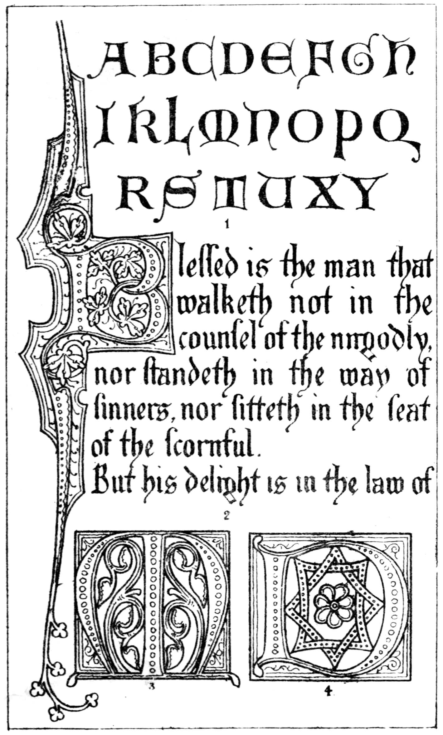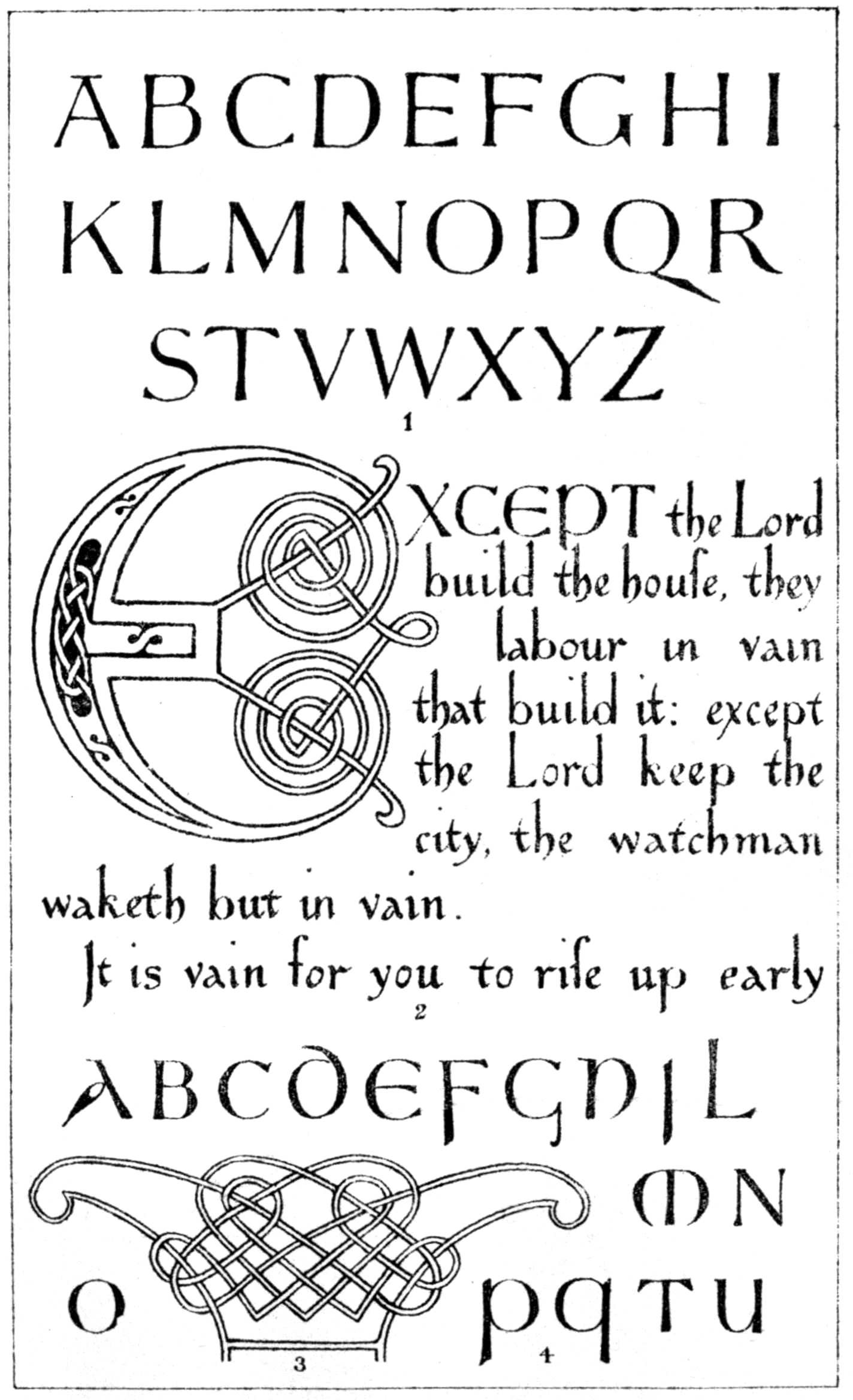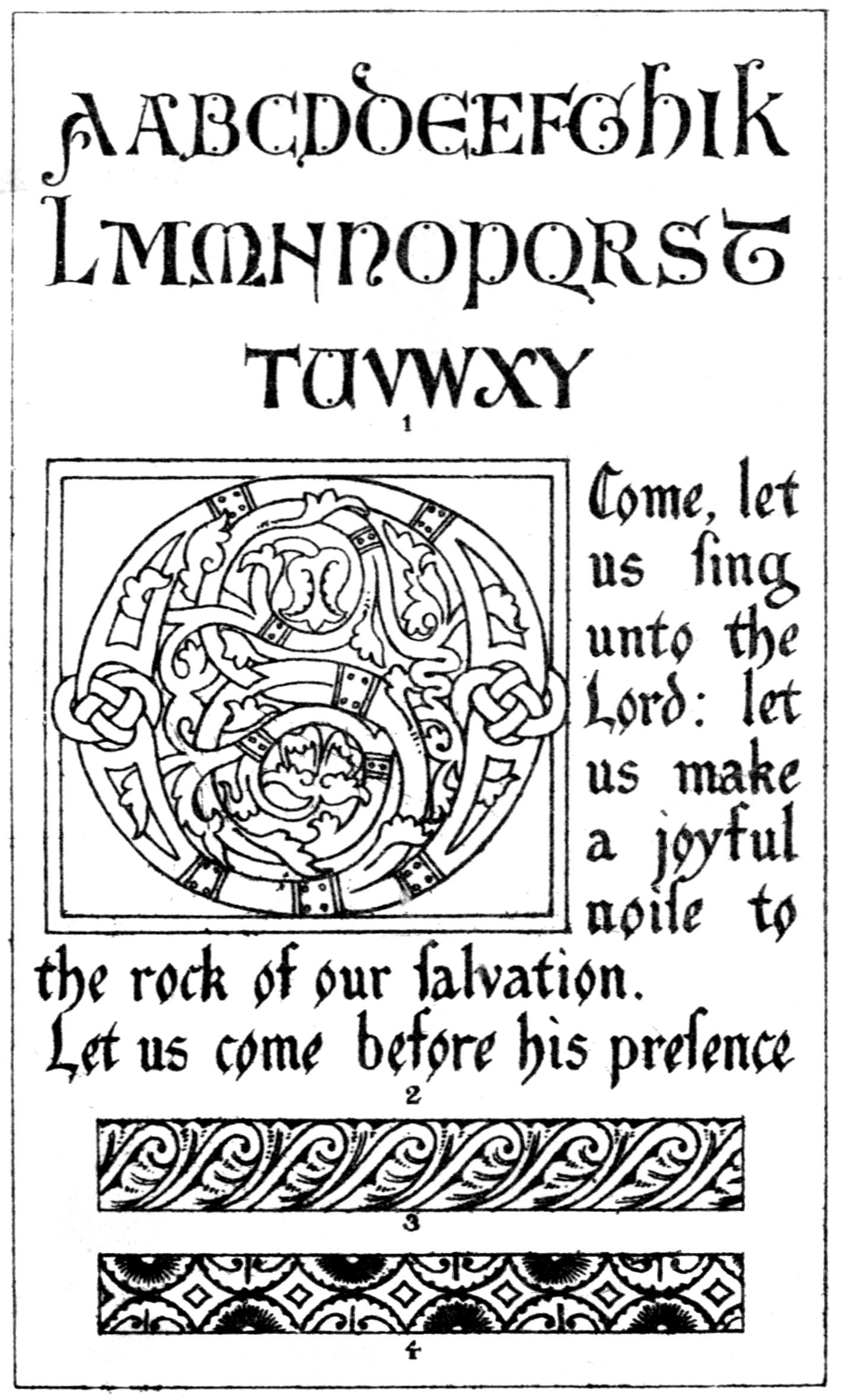 Plate III., from the same source as Plate I., gives, in figs. 1 and 4, two alphabets, and in fig. 2 one sentence, in the characters in which the Latin text of the original is written throughout the volume, with the usual form of initial letter; together with, in fig. 3, an ornament showing, on a largish scale, the principle upon which the most common interlacement of the Saxon school is usually worked out.