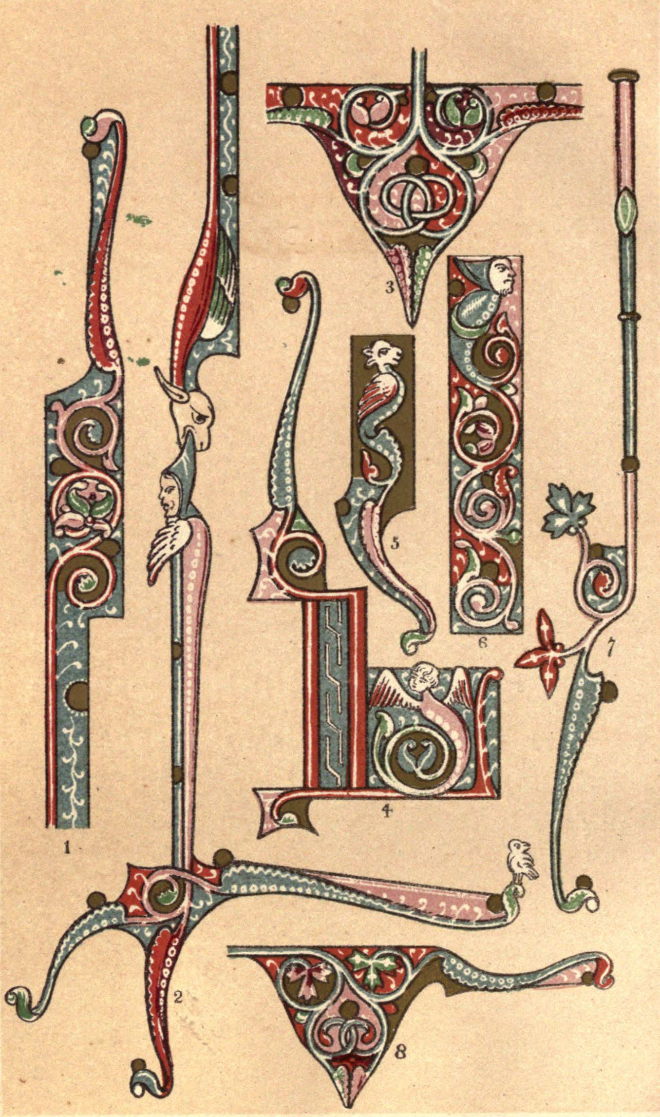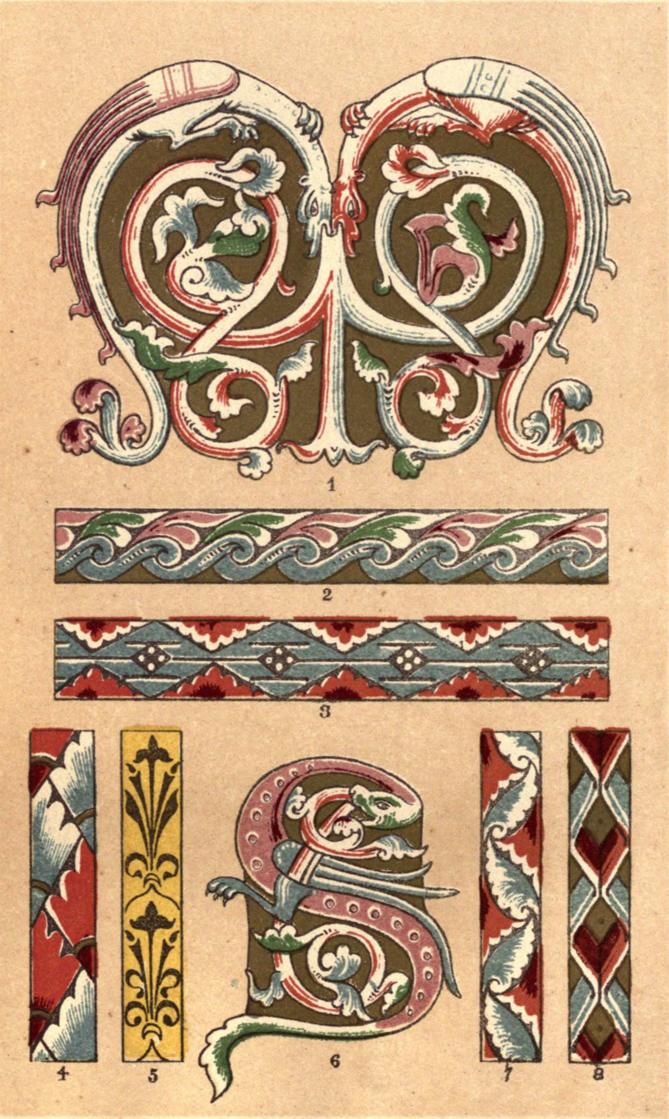 Plate V., fully coloured from the same source as Plate IV., offers in figs. 2, 3, 4, 5, 7, and 8, some easy borders, well adapted for enriching string courses or filling in long upright panels or pilasters. The initial letters (figs. 1 and 6) are designed with great spirit, and the student may profitably amuse himself by endeavouring to invent other capital letters made up as these are of apocryphal animals writhing in convoluted scrollwork.