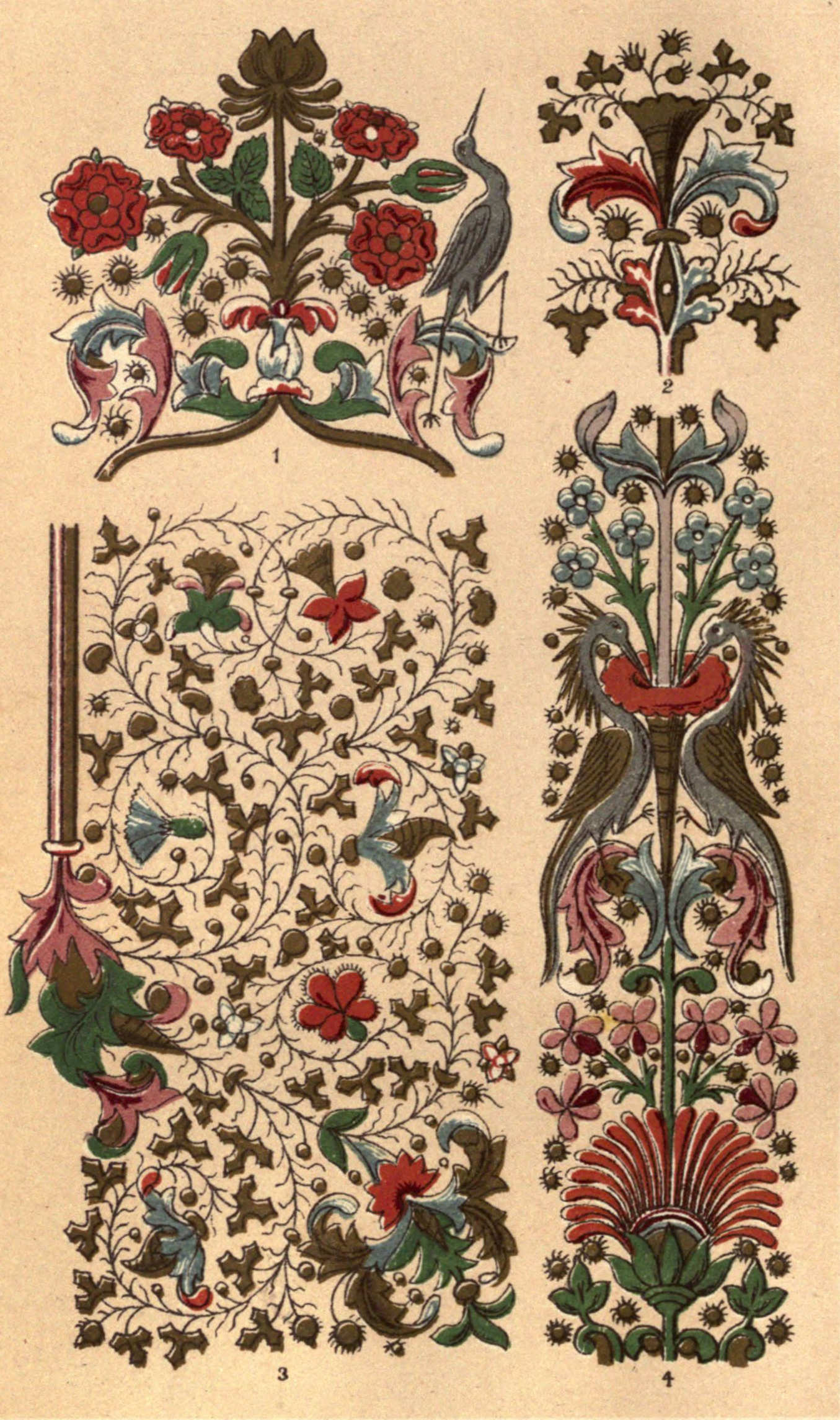 Plate II., from the same precious volume, provides some simple but excellent conventional forms, suitable for execution both on a small and on an enlarged scale. By repeating either one of the three borders at the bottom of the plate, very pretty margins may be produced, suitable either for surrounding a page of writing or for enclosing a panel in mural decoration.