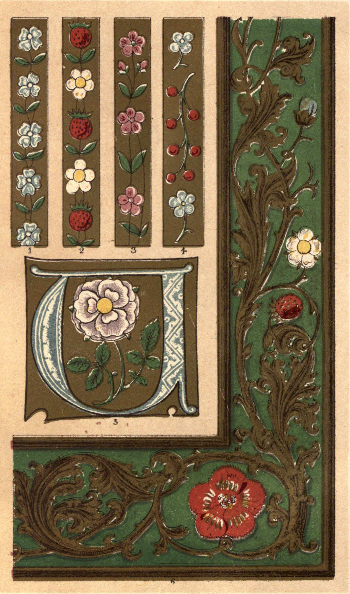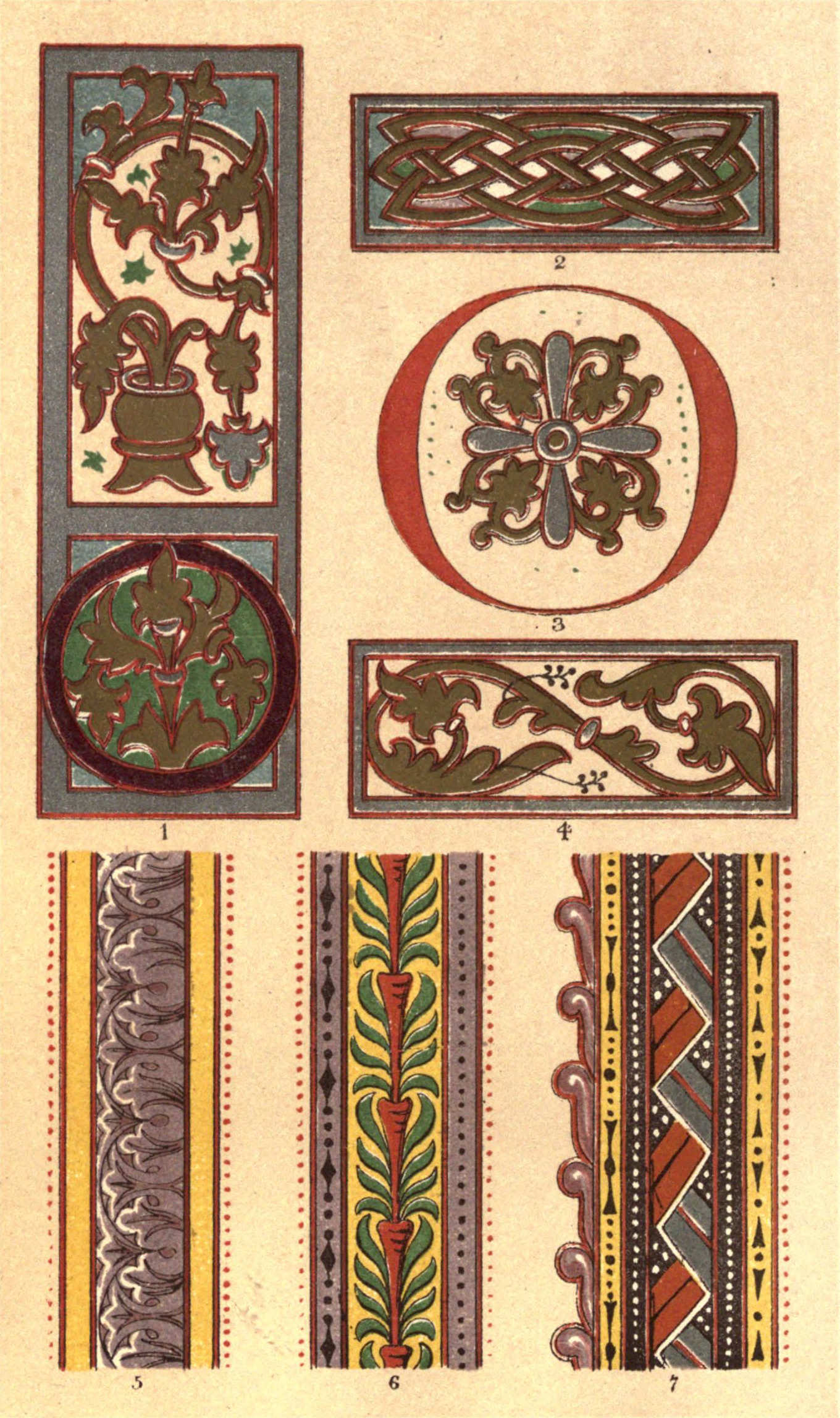 Plate IV., from the British Museum, Reg. 1, c. vii. This manuscript consists of the Books of Joshua, Judges, and Ruth, in the Vulgate version, with St. Jerome's prologues. It is probably of German execution, and is attributed by Sir Frederick Madden to the middle of the 12th century. In its illustrations may be recognised a series of good specimens of Romanesque forms. In these the scroll may be observed as having almost entirely superseded the Carlovingian interlacement, while in the foliated ends of the leading stems (more particularly in fig. 1) the germination of Gothic is distinctly perceptible. The student will scarcely fail to observe how entirely dependent this style of illumination is upon the steadiness with which the pen is handled for all its charm of expression.