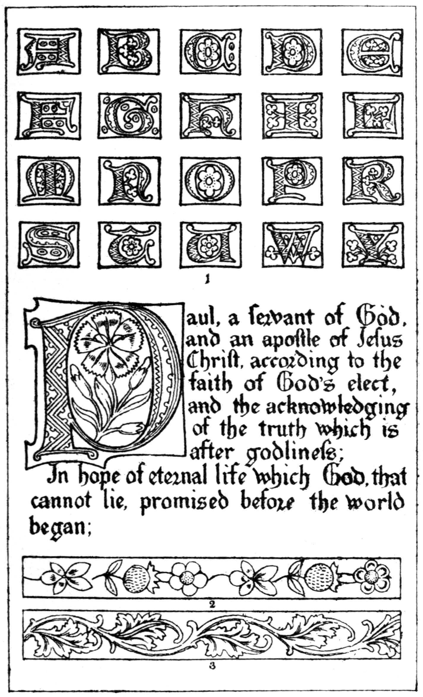 Plate XII. shows the general style of the lettering, both capital and lower-case, the initials, and the borders which pervade this beautiful triumph of Flemish art. Of these, figs. 3, 4, 5, 6, 7, and 8 are especially adapted for mural decoration, on, of course, a greatly enlarged scale.