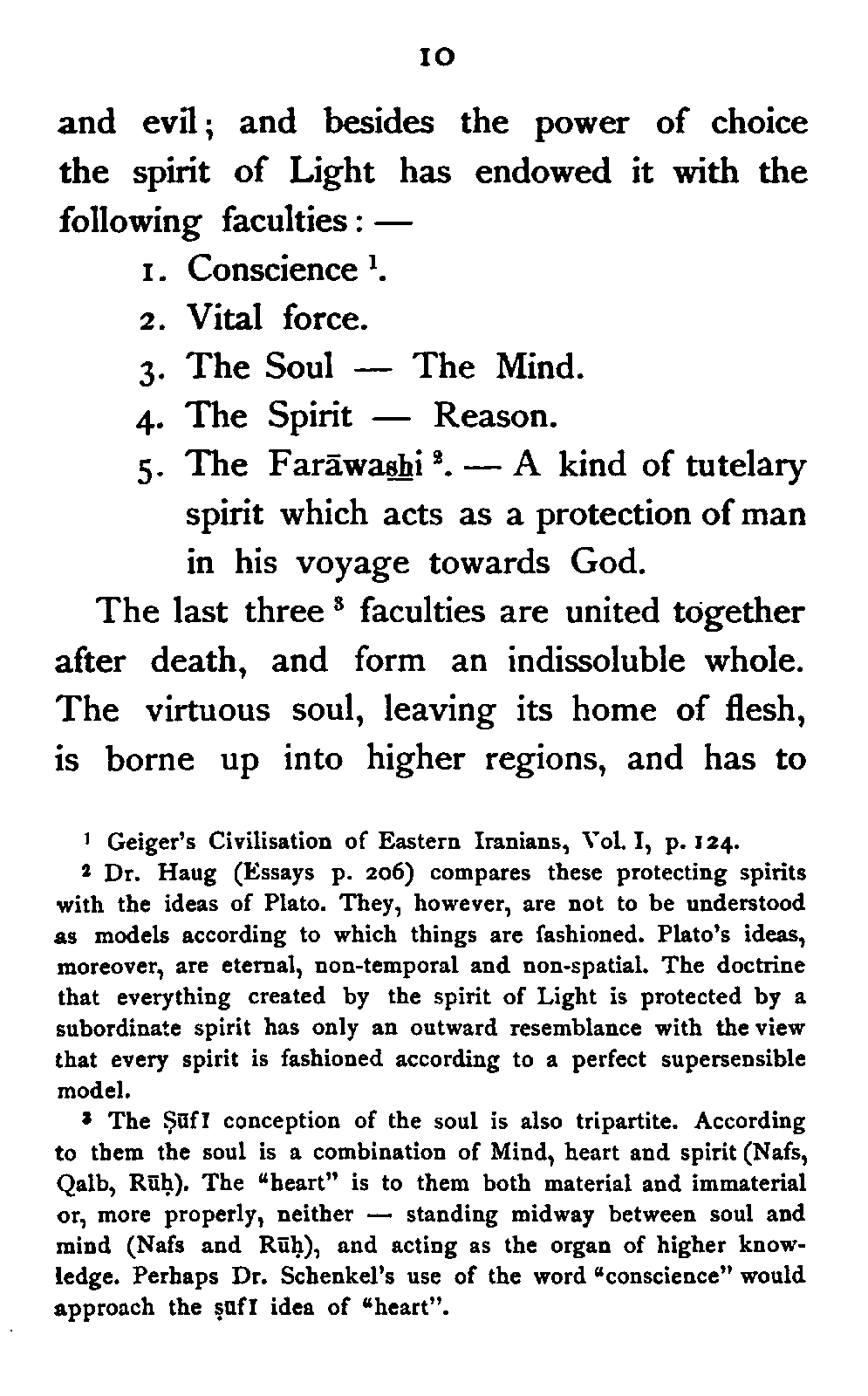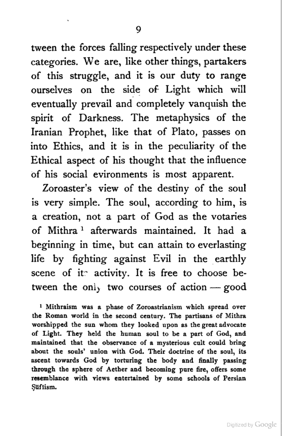 Zoroaster's view of the destiny of the soul is very simple. The soul, according to him, is a creation, not a part of God as the votaries of Mithra[9:1] afterwards maintained. It had a beginning in time, but can attain to everlasting life by fighting against Evil in the earthly scene of its activity. It is free to choose between the only two courses of action—good [Pg 10] and evil; and besides the power of choice the spirit of Light has endowed it with the following faculties:—