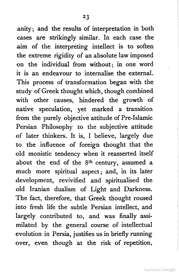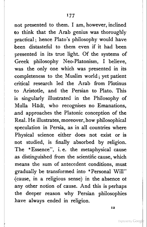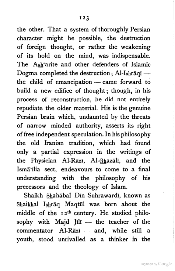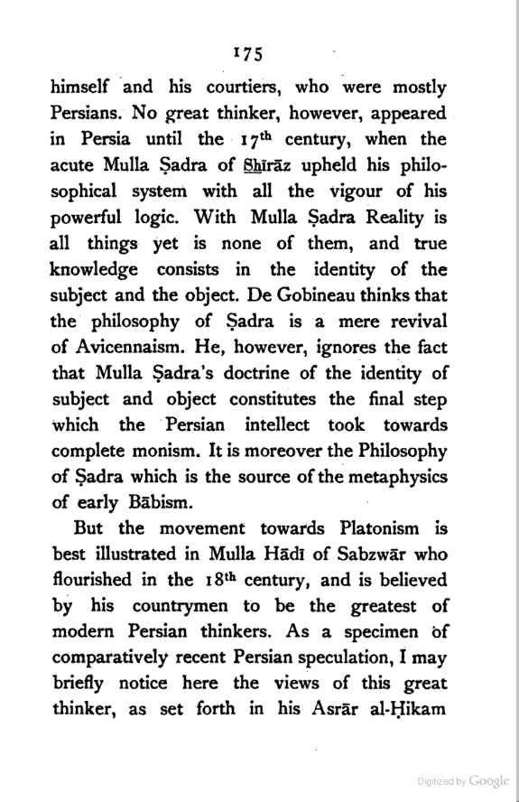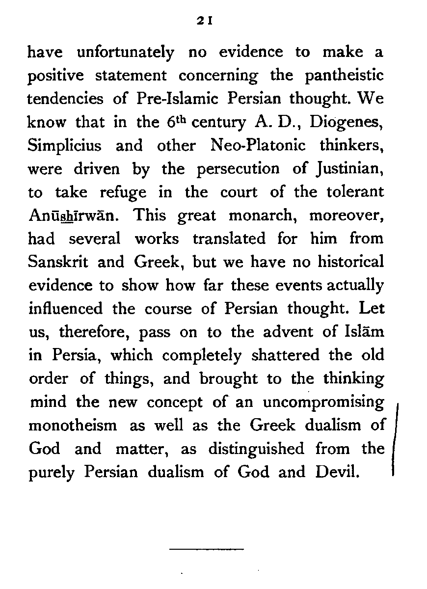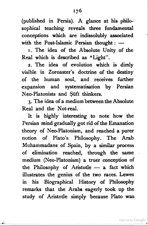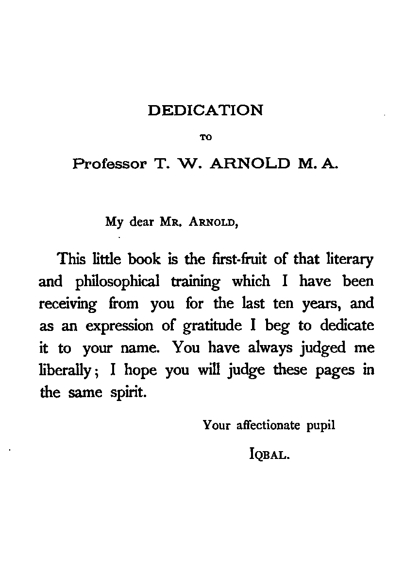 (a) I have endeavoured to trace the logical continuity of Persian thought, which I have tried to interpret in the language of modern Philosophy. This, as far as I know, has not yet been done.
