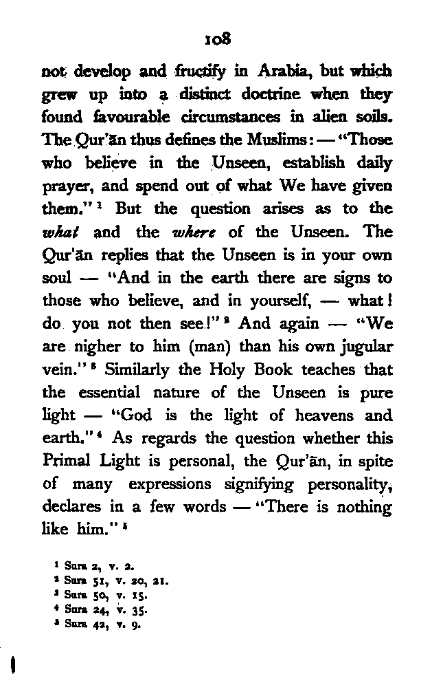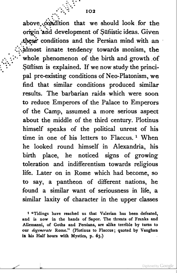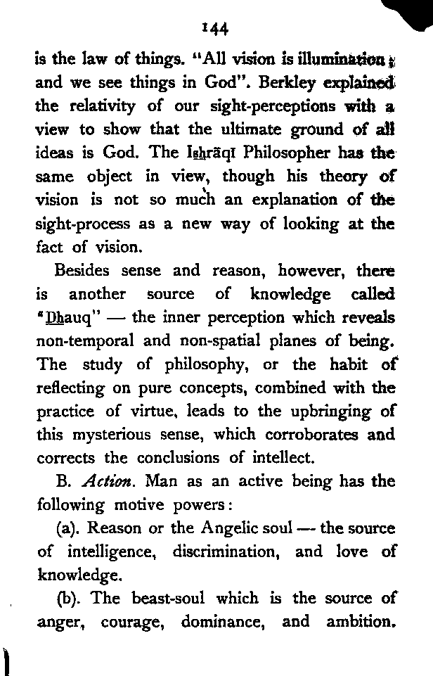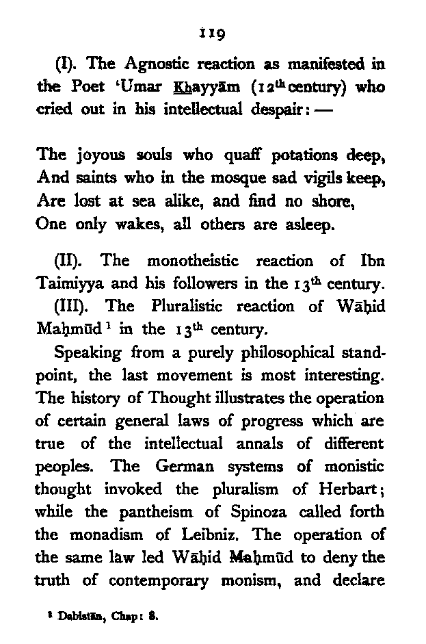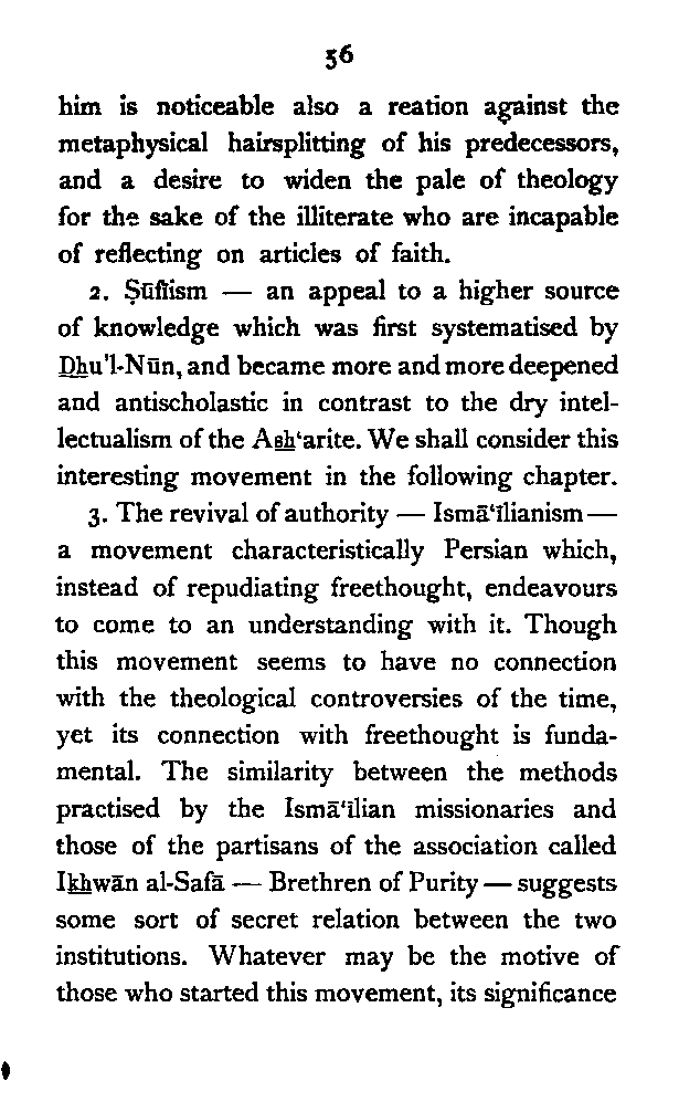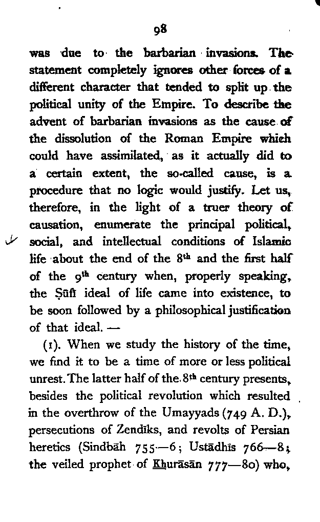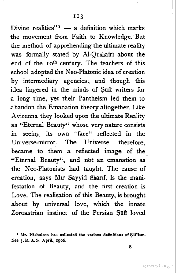 (b) I have discussed the subject of Ṣūfīism in a more scientific manner, and have attempted to bring out the intellectual conditions which necessitated such a phenomenon. In opposition, [Pg xi] therefore, to the generally accepted view I have tried to maintain that Ṣūfīism is a necessary product of the play of various intellectual and moral forces which would necessarily awaken the slumbering soul to a higher ideal of life.