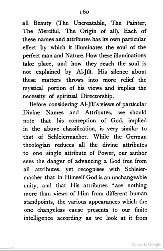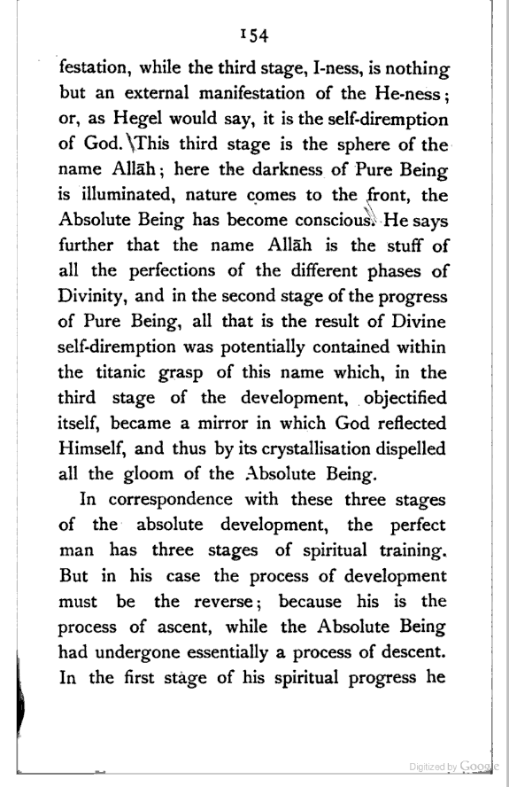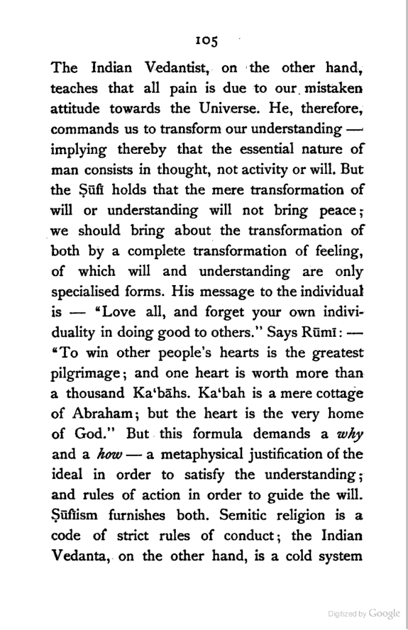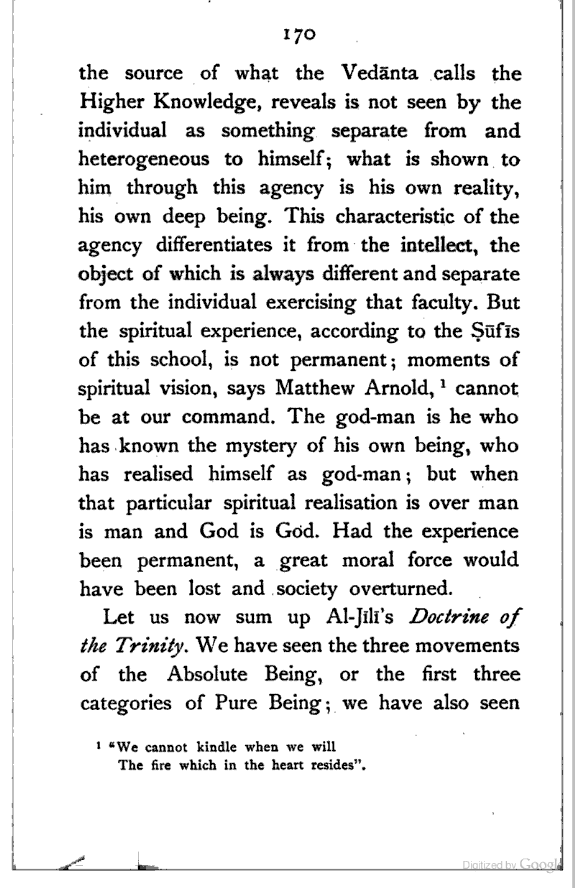 The most remarkable feature of the character of the Persian people is their love of Metaphysical speculation. Yet the inquirer who approaches the extant literature of Persia expecting to find any comprehensive systems of thought, like those of Kapila or Kant, will have to turn back disappointed, though deeply impressed by the wonderful intellectual subtlety displayed therein. It seems to me that the Persian mind is rather impatient of detail, and consequently destitute of that organising faculty which gradually works out a system of ideas, by interpreting the fundamental principles with reference to the ordinary facts of observation. The subtle Brahman sees the inner unity of things; so does the Persian. But while the former endeavours to discover it in all the aspects of human experience, and illustrates its hidden presence in the concrete in various [Pg viii] ways, the latter appears to be satisfied with a bare universality, and does not attempt to verify the richness of its inner content. The butterfly imagination of the Persian flies, half-inebriated as it were, from flower to flower, and seems to be incapable of reviewing the garden as a whole. For this reason his deepest thoughts and emotions find expression mostly in disconnected verses (Ghazal) which reveal all the subtlety of his artistic soul. The Hindū, while admitting, like the Persian, the necessity of a higher source of knowledge, yet calmly moves from experience to experience, mercilessly dissecting them, and forcing them to yield their underlying universality. In fact the Persian is only half-conscious of Metaphysics as a system of thought; his Brahman brother, on the other hand, is fully alive to the need of presenting his theory in the form of a thoroughly reasoned out system. And the result of this mental difference between the two nations is clear. In the one case we have only partially worked out systems of thought; in the other case, the awful sublimity of the searching Vedānta. The student of Islamic [Pg ix] Mysticism who is anxious to see an all-embracing exposition of the principle of Unity, must look up the heavy volumes of the Andalūsian Ibn al-‘Arabī, whose profound teaching stands in strange contrast with the dry-as-dust Islam of his countrymen.