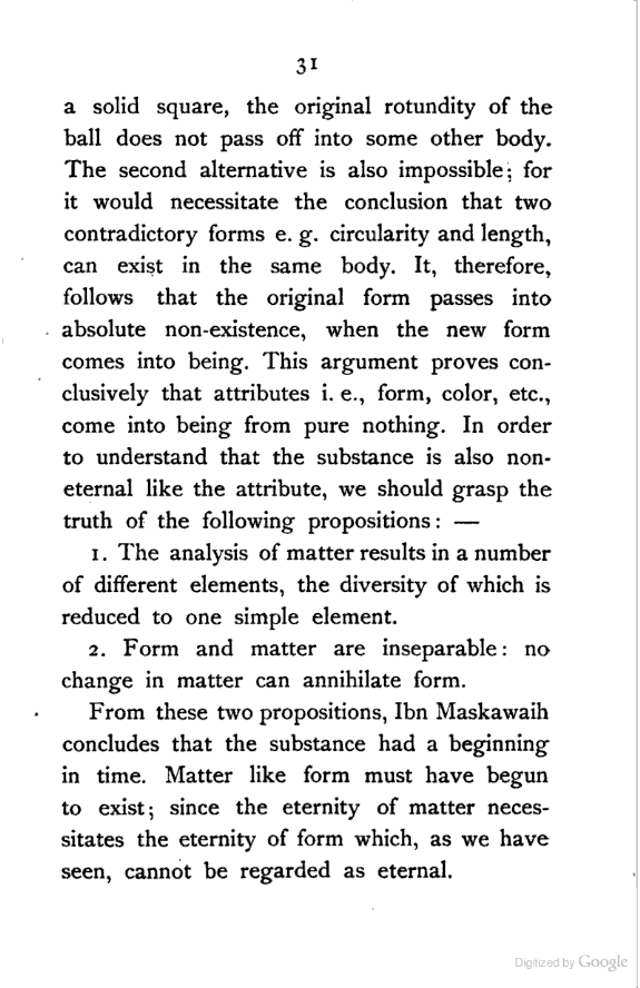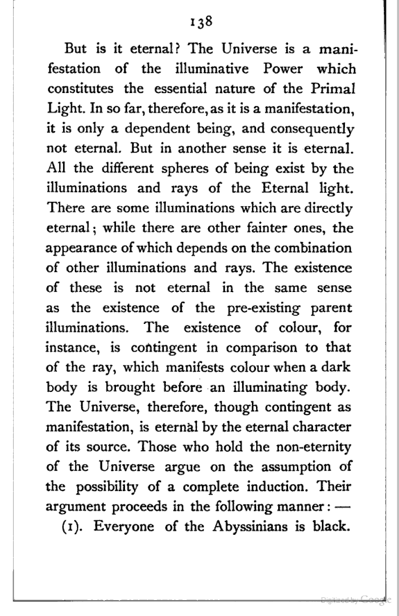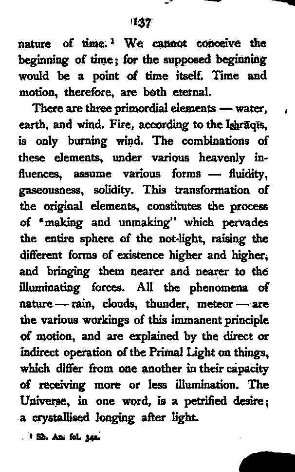 The object of this investigation is, as will appear, to prepare a ground-work for a future history of Persian Metaphysics. Original thought cannot be expected in a review, the object of which is purely historical; yet I venture to claim some consideration for the following two points:—