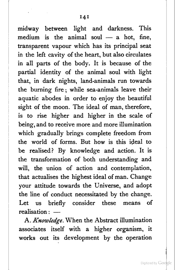 (5). The power of combining images and ideas, e.g. the winged man. When this faculty works under the guidance of the power which perceives individual ideas, it is called Imagination; when it works under the control of Intellect, it is called Conception.