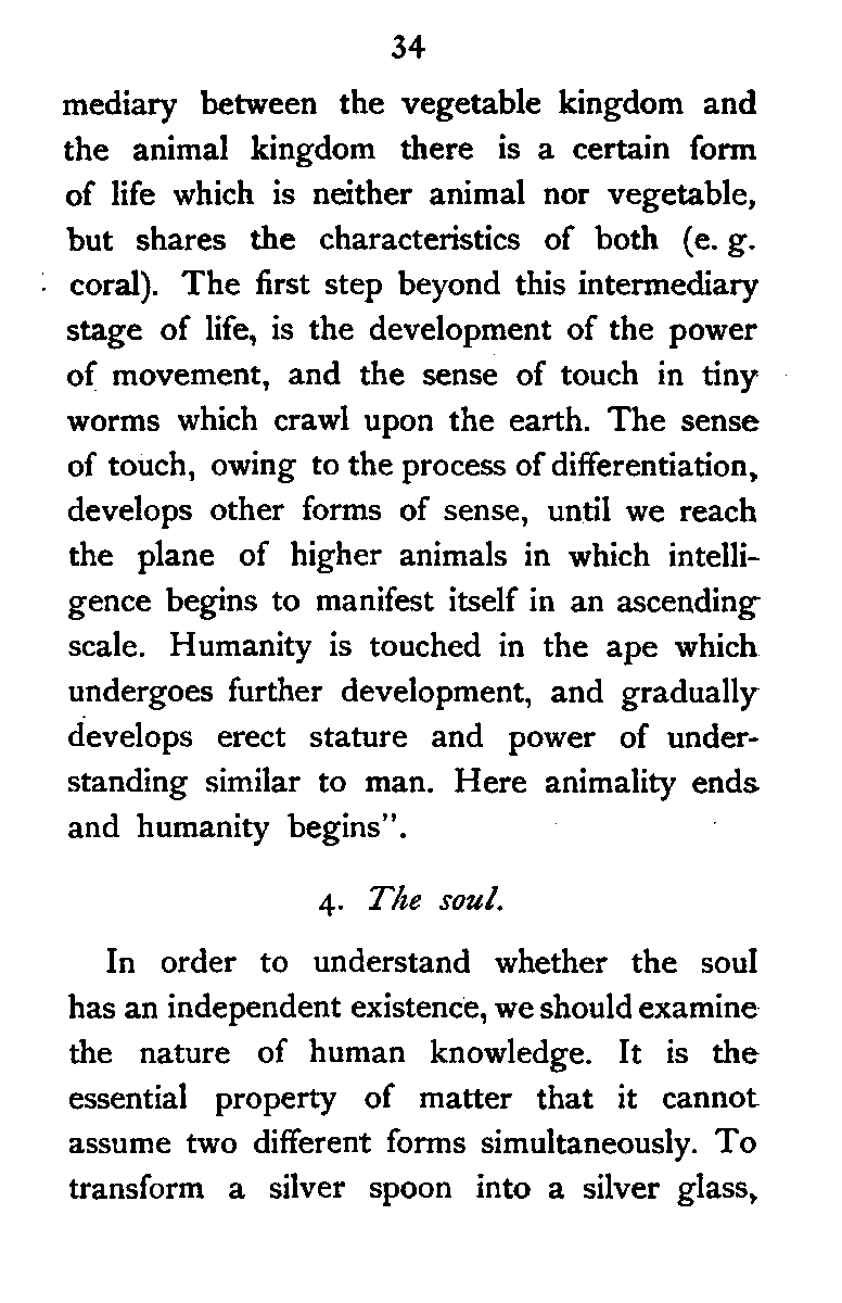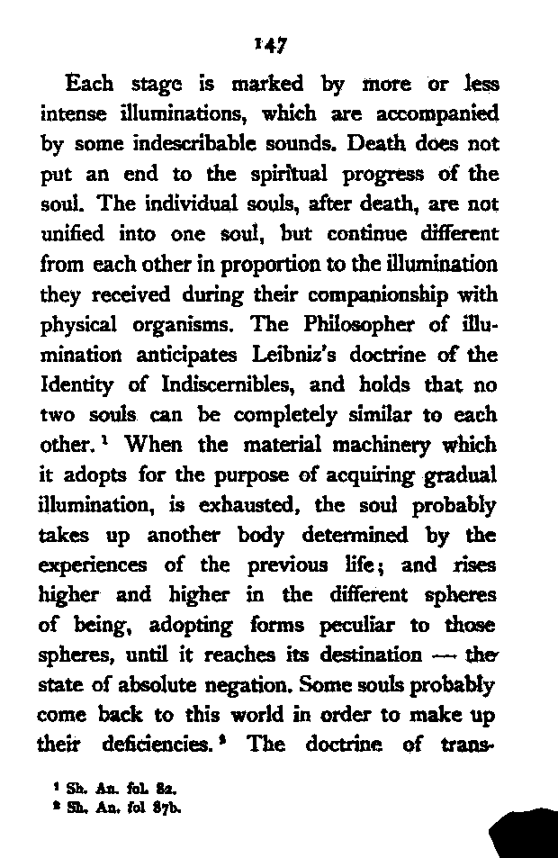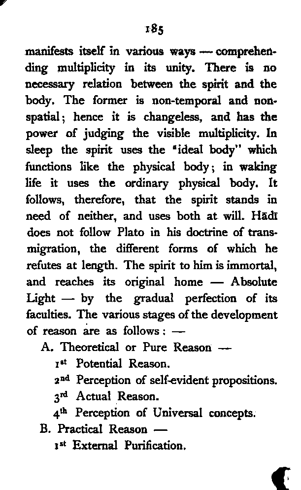 But it is the spirit which distinguishes man from other animals. This essence of humanity is a "unity", not oneness. It perceives the Universal by itself, and the particular through the external and the internal senses. It is the shadow of the Absolute Light, and like it [Pg 185] manifests itself in various ways—comprehending multiplicity in its unity. There is no necessary relation between the spirit and the body. The former is non-temporal and non-spatial; hence it is changeless, and has the power of judging the visible multiplicity. In sleep the spirit uses the "ideal body" which functions like the physical body; in waking life it uses the ordinary physical body. It follows, therefore, that the spirit stands in need of neither, and uses both at will. Hādī does not follow Plato in his doctrine of transmigration, the different forms of which he refutes at length. The spirit to him is immortal, and reaches its original home—Absolute Light—by the gradual perfection of its faculties. The various stages of the development of reason are as follows:—